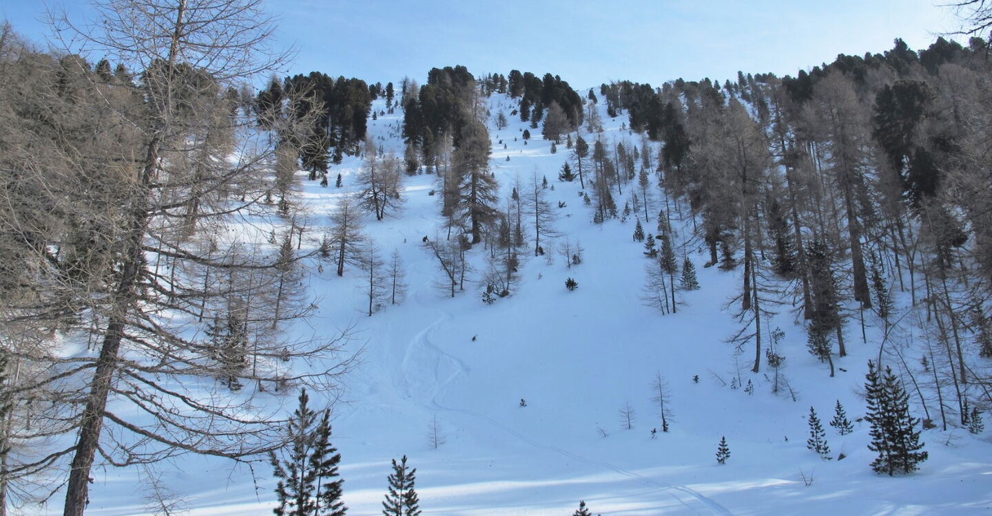 Der Aufstieg ist einfach zu finden. Aber auf der Abfahrt gibt es viele Abzweiger, die beachtet werden müssen. Die Abfahrt führt über einen Nordwesthang. Folgende Ausrüstung wird empfohlen: Produkte für alpine Sicherheit im Schnee, Tourenski und Skitourenhelm. Es gibt keine Einkehr auf der Tour. Beste Jahreszeit: Januar bis April. Uns erwarten kurze Stücke mit bis zu 35° Hangneigung.