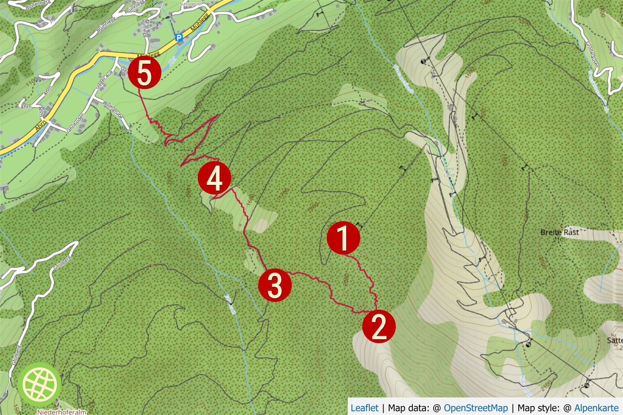 Hier beginnt eine rasante Abfahrt. Nach etwa 1 km kommen wir auf die Forststraße und folgen dieser. Wir passieren die Nußbaumlahner Alm, und nach 200 m fahren wir links über die Stegerwiese weiter.