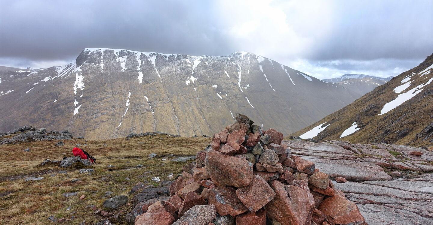 Auf dem grasigen Untergrund ist der Pfad kaum auszumachen, die Orientierung bleibt aber einfach, da wir mittig auf dem Bergrücken steil aufsteigen. Auch auf dem nachfolgenden Schotterfeld erfolgt der Aufstieg weglos, einige Steinmännchen sind nicht hilfreich. Wir erreichen einen ersten Vorgipfel, der durch einen Steinhaufen markiert ist, beim zweiten Steinhaufen haben wir den Gipfel des 03 Stob Dubh (958 m) erreicht. Mindestens 20 weitere Gipfel (Munros) sind in Sichtweite und es folgt eine astreine Gratwanderung.