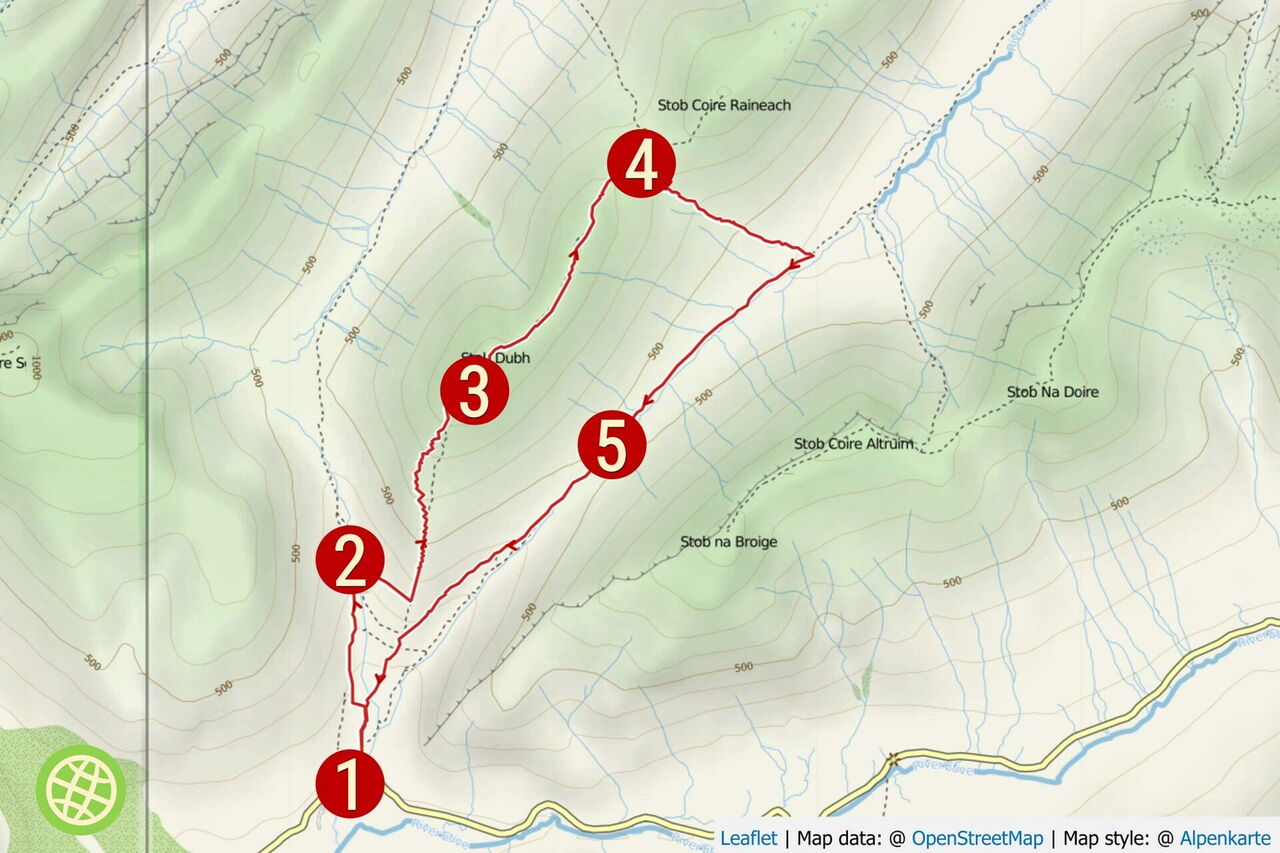 Pkw-Anfahrt: Der Ausgangspunkt der Wanderung liegt 50 km südlich von Fort William. Von der A82 zweigt eine Stichstraße in ein Seitental ab und man erreicht nach genau 10 km eine Brücke, hinter der man auf der linken Seite in einer Haltebucht parken kann. Weitere Parkplätze gibt es nach 1 km auf der rechten Seite. Geokoordinaten Start: 56.618667 -4.983517. Busanbindung: keine.