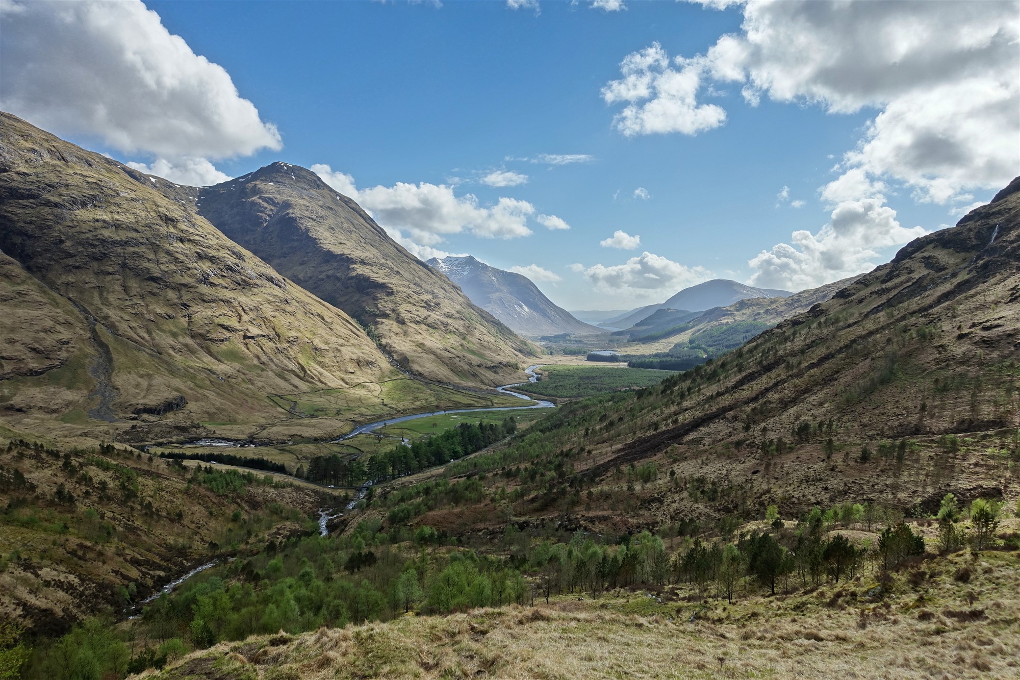 Vom 01 Start und Ziel (91 m) hinter der Brücke – aus Sicht der Pkw-Anfahrt – folgen wir dem ausgeschilderten Public Forst Path rechts Richtung Glencoe. Kurz hinter dem ersten Gatter gabelt sich der Weg. Nach starken Regenfällen kann es vorkommen, dass die Querung des Baches unmöglich wird.
