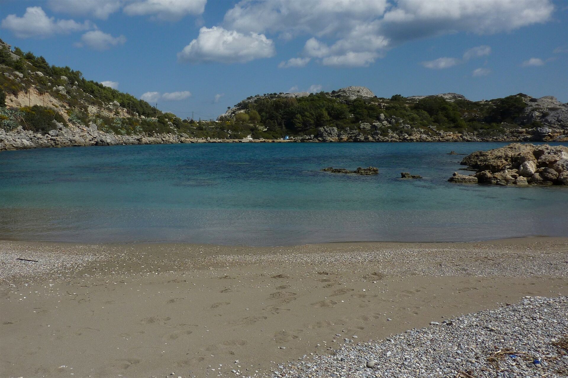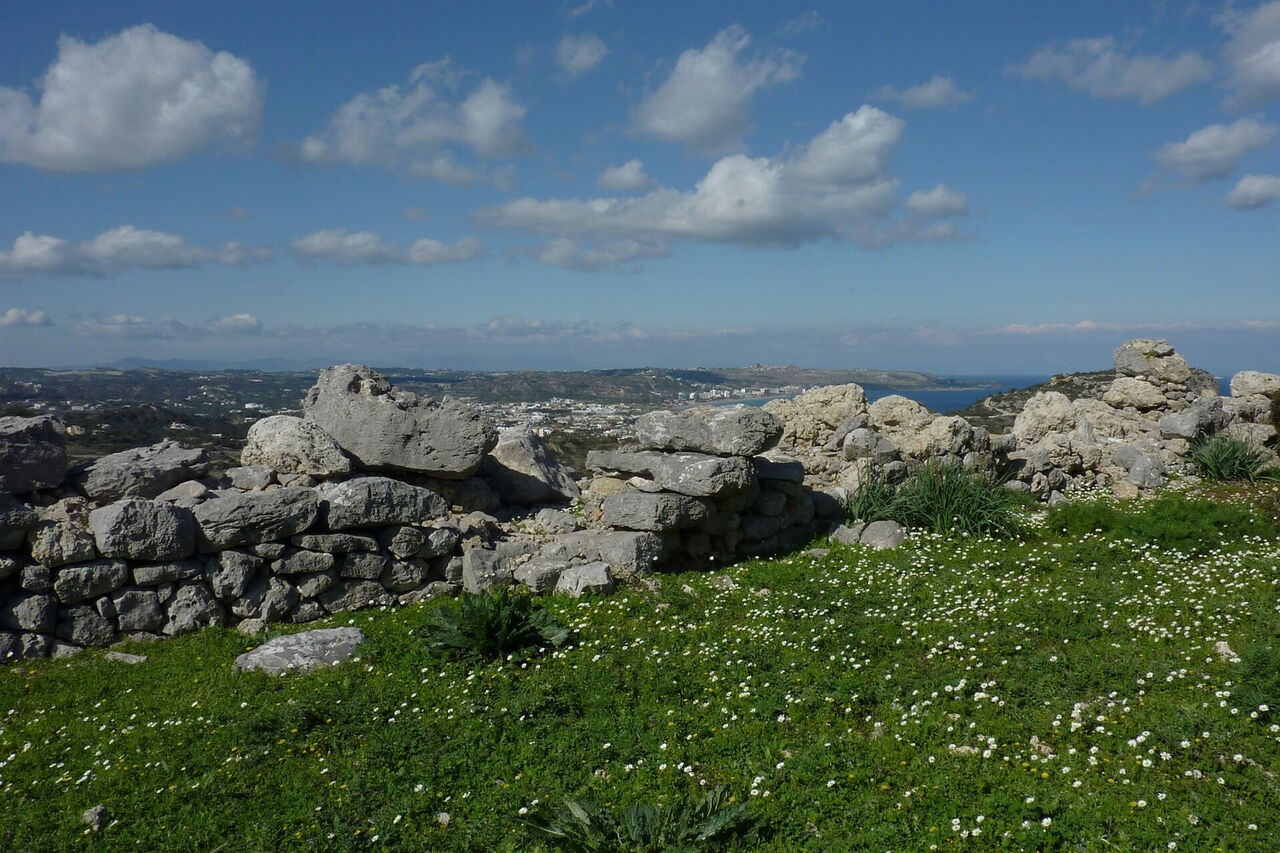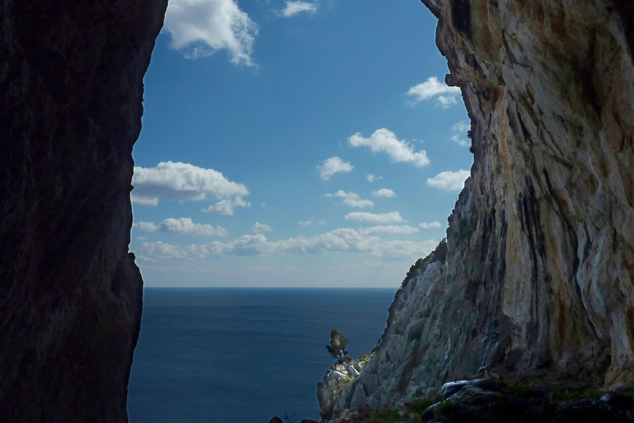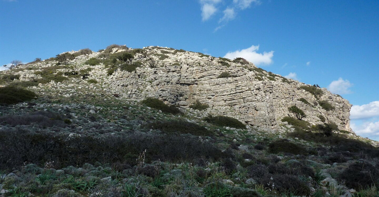 Gemächlich gewinnt der Pfad an Höhe, unterhalb der rechts von uns liegenden mächtigen Felswand. 330 m hinter dem Ziegengatter führt rechts bergauf ein Pfad zu einer großen offenen (03) Höhle (112 m) und Kletterstelle. Beim Anstieg wird etwas Kletterfertigkeit gefordert, um endgültig den großen Schlund der Höhle zu erreichen. Wir staunen über die atemberaubenden Ausblicke auf das tiefblaue Meer. Anschließend gehen wir zunächst auf dem gleichen Weg zurück, um dann unsere Wanderung auf dem eingeschlagenen Pfad fortzusetzen. Der Pfad ist nun nicht mehr so ausgeprägt, dafür helfen Steinmännchen bei der Orientierung. Die mächtigen Felswände liegen hinter uns und es ergibt sich ein wunderschöner Blick auf den langen Strand von Afandou.