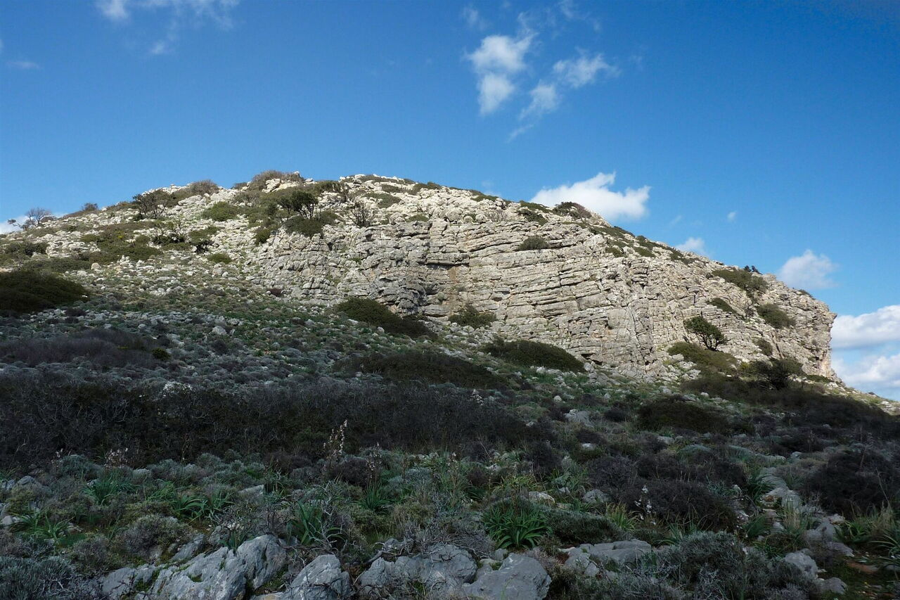 Wir orientieren uns weiterhin an zwei links liegenden Felsen unterhalb des Plateaus. Dort gelangt man über die begehbaren Burgmauern auf das Gipfelplateau, wir haben die (05) Festung Erimokastro (142 m) erreicht. Auf dem Plateau gehen wir bis zum höchsten Punkt vor, markiert durch einen Betonpfeiler. Der Weg durch das dichte Buschwerk ist nicht einfach zu finden. Wir halten uns halb links und gelangen so an die nördlich gelegenen Befestigungsmauern. 70 m weiter befindet sich ein Metallpfeiler. Auch gibt es hier einen Abstieg vom Plateau zu einem Pfad, den wir rechts weiter bergab begehen. Im weiteren Verlauf treffen wir auf eine Ziegenhaltung, queren ein Ziegengatter und gehen auf der nachfolgenden Schotterpiste zunächst 150 m bergab – vorbei an den Überresten eines amerikanischen M24-Chaffee-Panzers aus dem Zweiten Weltkrieg – und dann bei der Kreuzung links. Auf der beginnenden Asphaltstraße gehen wir beim Hotel Cathrin rechts bis zum Ausgangspunkt zurück.
