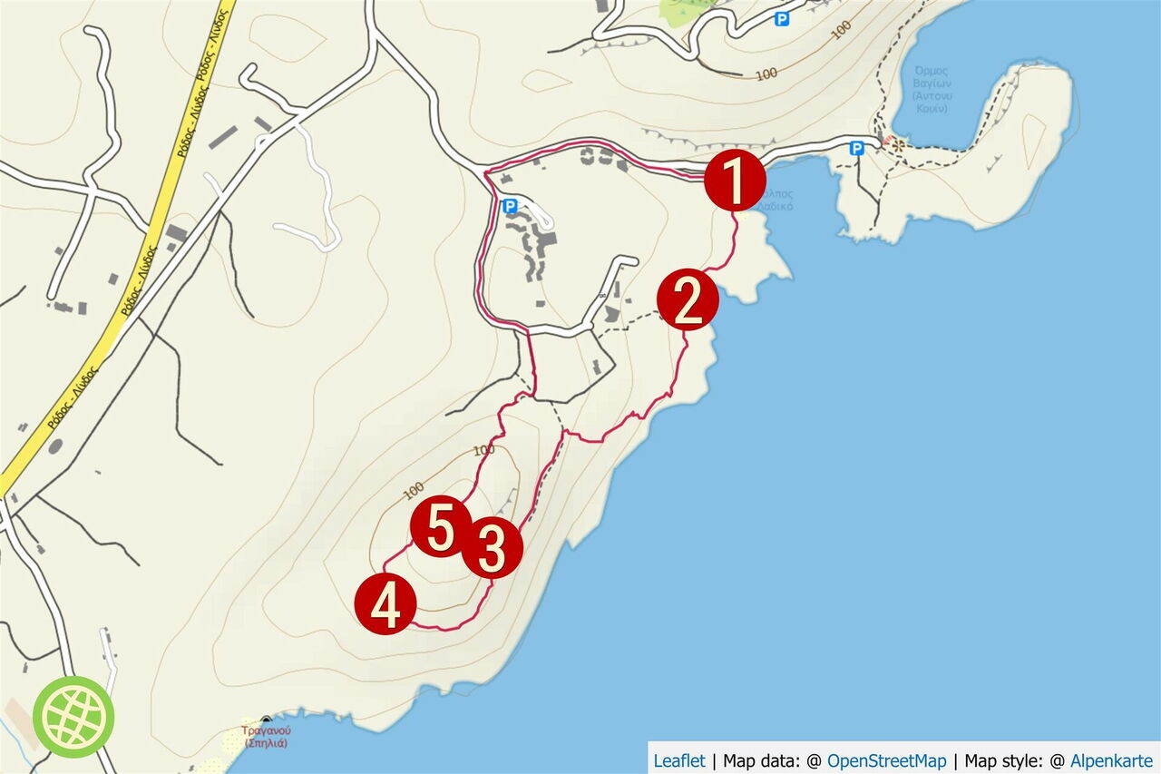 Vom Hotel Ladiko gehen wir zunächst auf der weiterführenden Straße und bei der folgenden Weggabelung rechts herunter zum (01) Start und Ziel am Strand von Ladiko (8 m). Hinter der Taverne und direkt bei dem trockengelegten Schiff beginnt ein Pfad. Auf diesem gehen wir bei der nächsten Möglichkeit rechts und dann vor der folgenden Dusche bergauf über eine kleine Einsattelung.