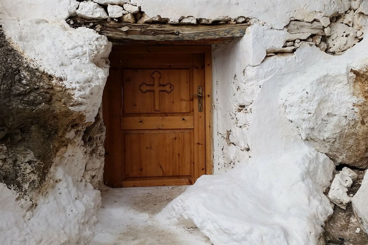Beim Abstieg über die fruchtbaren Felder staunen wir über die atemberaubenden Ausblicke auf die vorgelagerten Inseln und freuen uns auf ein erfrischendes Bad in der Ägäis. Nach so viel Natur folgt ein bisschen Kultur, wir erreichen die Grotte von Amarthos. Unter einem riesigen Felsblock befindet sich eine niedrige Höhle. Ein Teilbereich ist zugemauert und wurde zu einer Kapelle umgestaltet. Das Außergewöhnliche: In dieser extrem trockenen Region tropft es von der Decke in Blechwannen. Unweigerlich fragt man sich, wo das Wasser herkommt. Es haben sich Tropfsteine gebildet, wovon einer tatsächlich, mit viel Einbildung, wie eine Frauenbrust aussieht. Damit hat das Ganze nun eine besondere Bedeutung und ein Ikonenbildchen zeigt das auch. Auf diesem hat die Mutter Maria ihr Kleid geöffnet und gibt dem Jesuskind eine Brust zum Trinken. Das ist nun kein gewöhnliches Wasser, das da von der Decke tropft, sondern "Milch der Mutter Gottes".