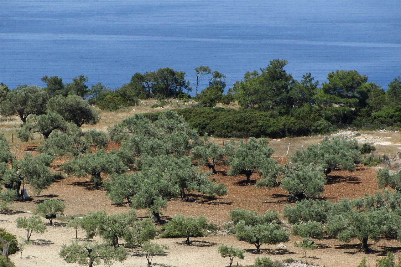 Vom (01) Start und Ziel (247 m) gehen wir auf der Anfangsstraße zurück in das Hochtal mit seinen Weinreben und Olivenbäumen. Vorbei geht es an einem Steinhaus, bis wir nach einem kleinen Anstieg an der Weggabelung rechts bergab Richtung Meer gehen, abzweigende Wirtschaftswege ignorieren wir.