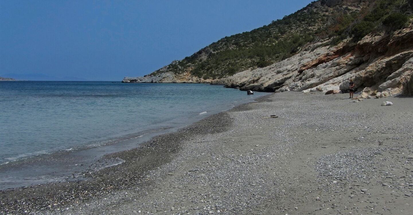 Hier gehen wir rechts, durch die Streusiedlung, bis zu einem alleinstehenden Haus. Hinter diesem führt ein Pfad nur einige Meter halb links bergauf, um dann rechts auf der Schotterpiste weiter zu gehen. Diese endet bereits nach 50 m, wir gehen links herunter auf der anschließenden Schotterpiste bis zum (03) Strand von Paleochora (0 m). Der 100 m lange und 20 m breite Strandabschnitt besteht aus Kieselsteinen mit sandigen Stellen. Das Wasser ist kristallklar man kann bequem baden gehen.