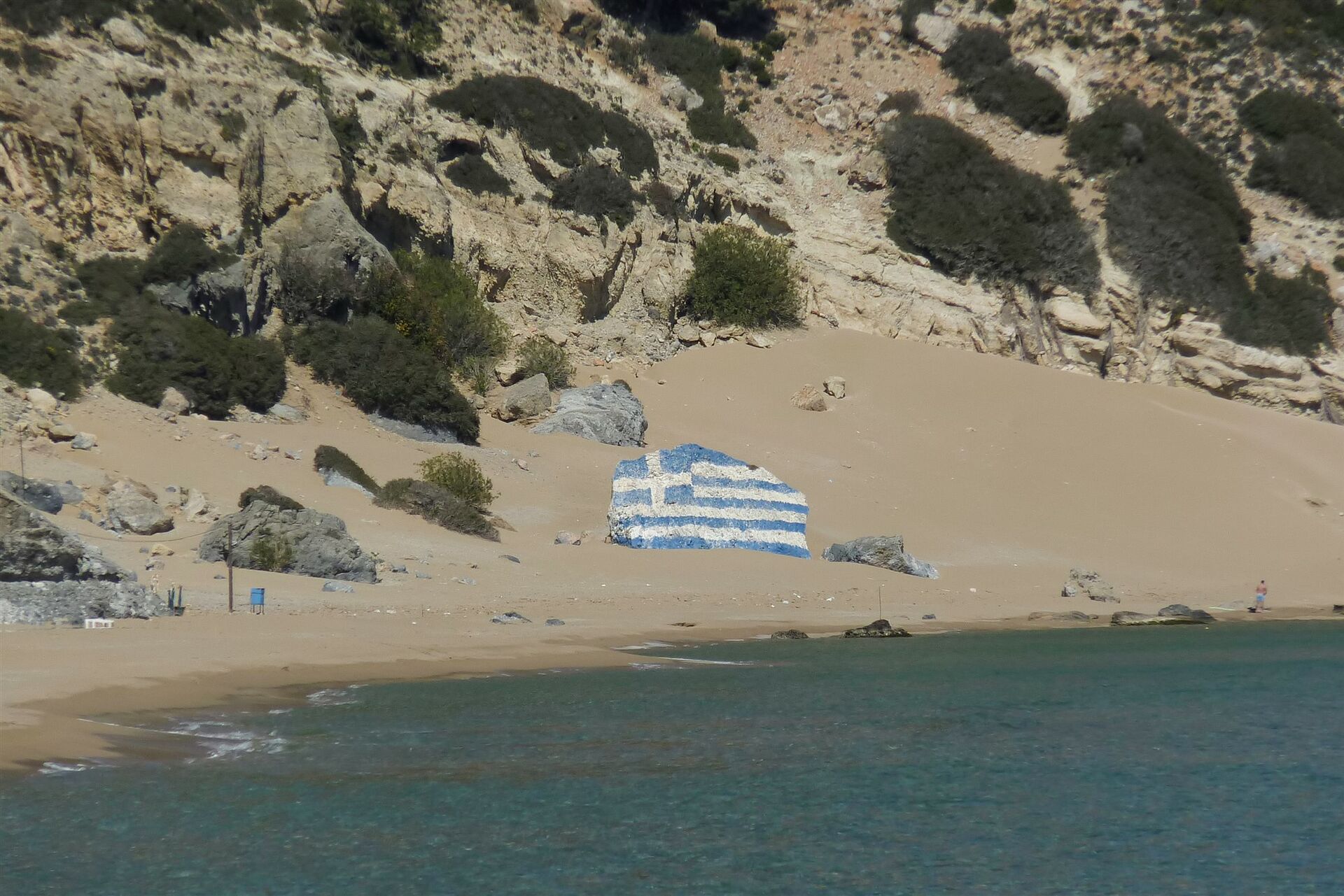 Wir gehen am (01) Strand von Tsambika (2 m) in Richtung des großen Steins, der mit der griechischen Flagge bemalt ist. Der folgende Aufstieg stellt die schwierigste Passage der Wanderung dar. Zunächst steigen wir über die dahinter liegenden Dünen zu einem Oleanderbusch auf, der auf einem Hügel steht. Direkt dahinter steigen wir unter Zuhilfenahme der Hände in einer Erosionsrinne auf, bis wir auf einen im Hang quer verlaufenden Pfad treffen. Viele Pfade erschweren die Orientierung. Wir halten uns in Richtung des Kaps, bis wir links oberhalb eine Höhle ausmachen können. Bei einem Steinmännchen unterhalb der Felsen machen wir eine 180°-Kehrtwendung, klettern abermals unter Zuhilfenahme der Hände durch eine kleine Rinne und treffen auf den Wanderpfad. Immer den Steinmännchen folgend, steigen wir nun zu einer Einsattelung auf.