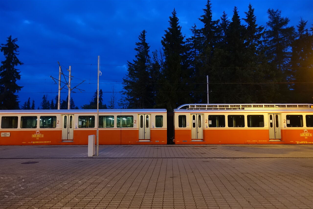Den Bahnhofsplatz der elektrischen Schmalspurbahn 01 TEŽ Štrbské Pleso (1322 m) verlassen wir in nördliche Richtung und gehen an dem rechts von uns liegenden großen Parkplatz vorbei in Richtung des großen Funkturms. Sobald die Straße endet, marschieren wir links und sofort wieder rechts, nun durch die Fußgängerzone des Ortes. Nach kurzem Aufstieg gehen wir an der Straßenkreuzung weiter in nördliche Richtung entlang der Straße, vorbei an einem weiteren Parkplatz. Nach 100 m verlassen wir die Straße – noch vor der Brücke – nach links zum ausgeschilderten Spezialitätenrestaurant Koliba Patria.