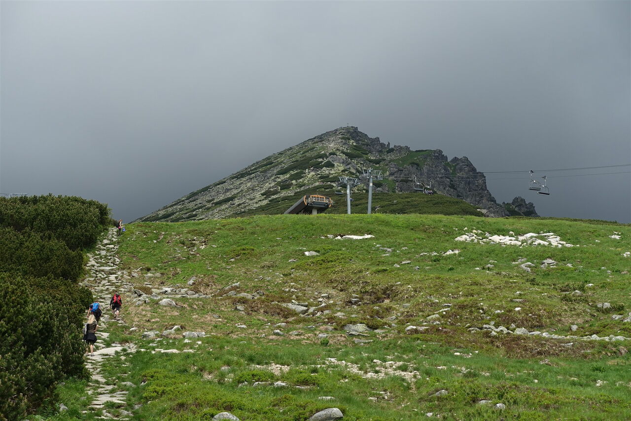 Der Pfad durch den Wald führt direkt unterhalb der großen Sprungschanze entlang, bis wir dann auf die Liftspur eines Schlepplifts gelangen. Kurz später gehen wir dann auf dem Pfad – im Winter eine Skipiste – parallel zum Schlepplift. An dieser Stelle wurde 1943 der erste Schlepplift der Hohen Tatra gebaut! Ein mit Steinen verlegter Pfad führt nun mittig zwischen zwei Sesselliften bis zur 03 Chata pod Soliskom (1840 m).