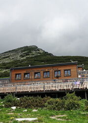 Am See angekommen – linker Hand befindet sich das Restaurant Koliba Patria – gehen wir rechts weiter und am Hochhaus des Hotels Patria vorbei. Hinter einem kleinen Haus, das fast nur aus einem Dach besteht, verlassen wir dann den See 02 Štrbské Pleso (1346 m) nach rechts und folgen der Ausschilderung Richtung Chata pod Soliskom.