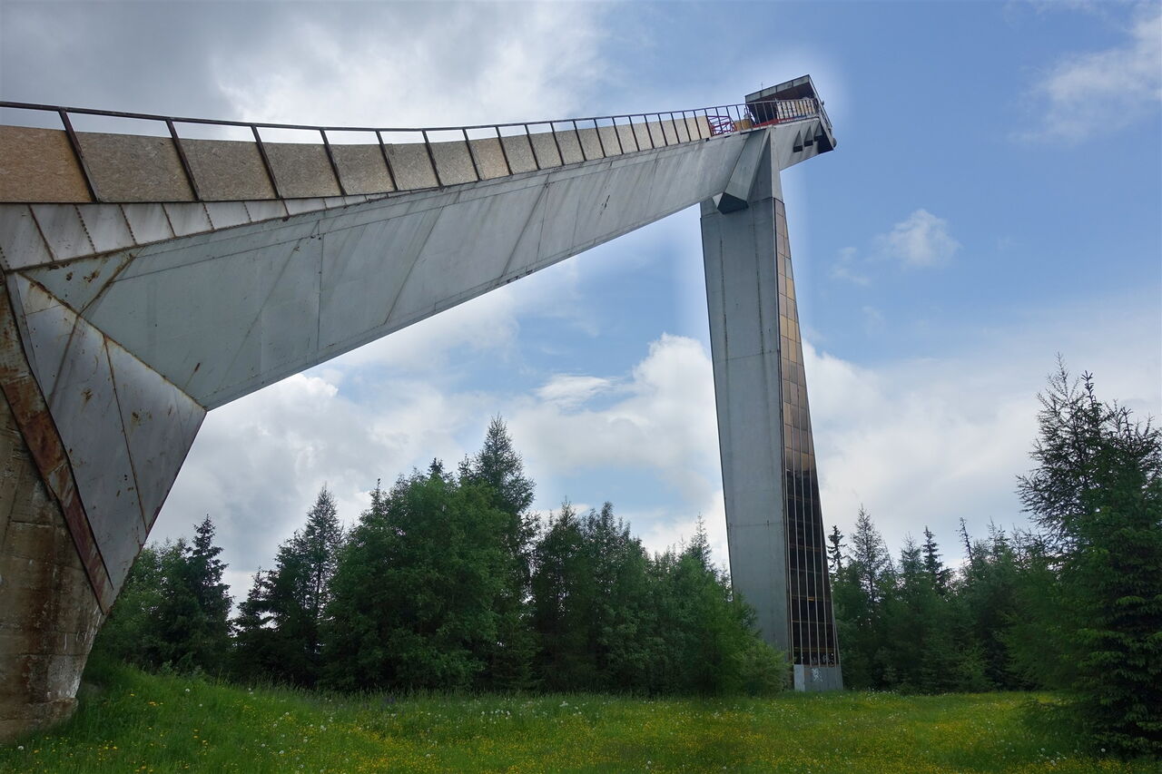 Auf Höhe der Liftanlagen und der dahinter liegenden kleinen und großen Sprungschanze beginnt dann die 02 Mlynická Dolina (1333 m). Parallel zu einem Sessellift folgen wir dem gelb markierten Wanderweg. Hinter einem sehr modern gestalteten Wasserpumpenhaus gabelt sich der Weg, wir gehen halb links in Richtung des Sessellifts.