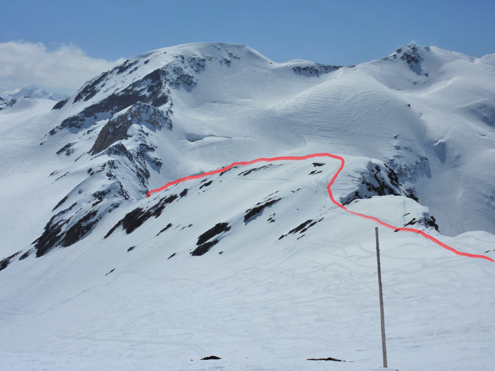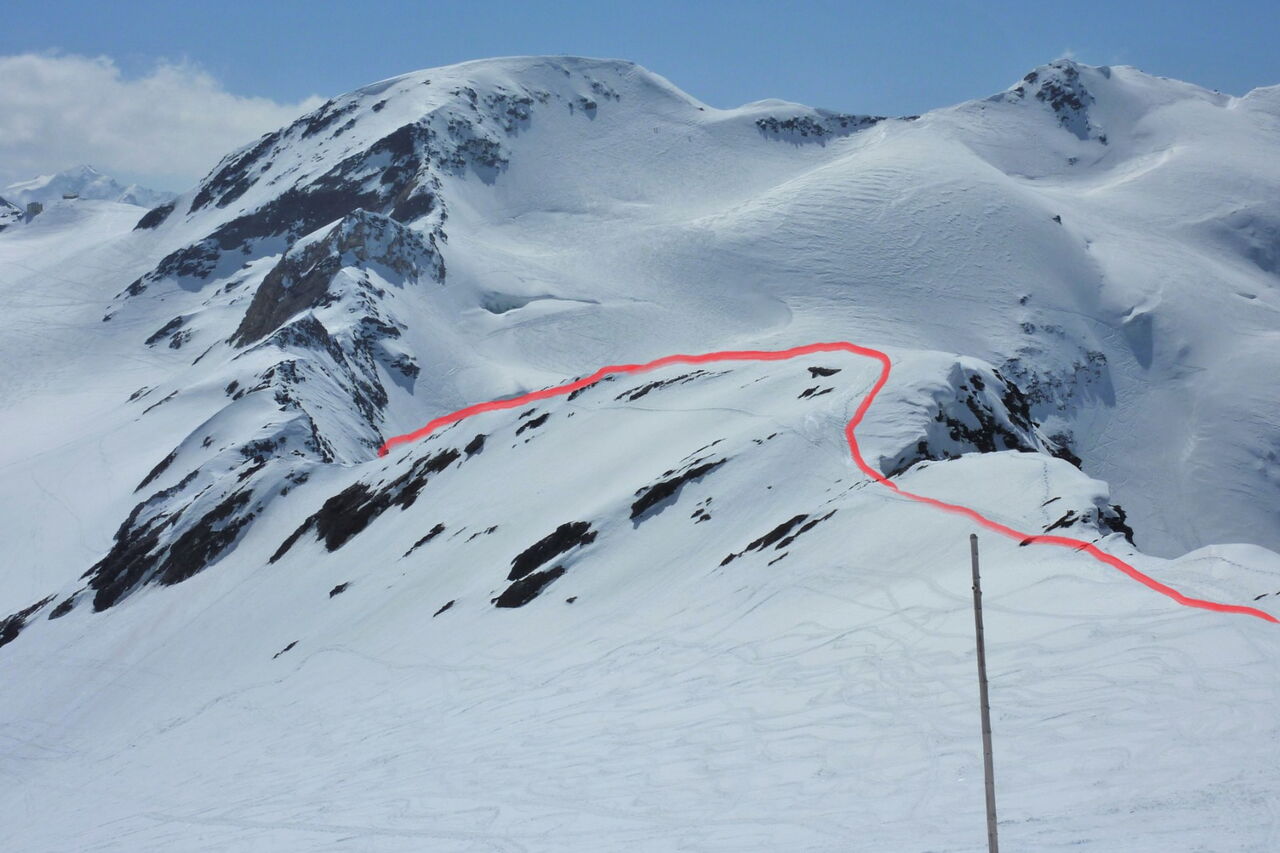 Bei der Bergstation des Lifts B Seilbahn II erreichen wir nach kurzer Abfahrt den Suldenferner. Dort gehen wir ca. 1,5 km bergauf, bis wir uns dann links an den sehr steilen Aufstieg zum Eisseepass machen.
