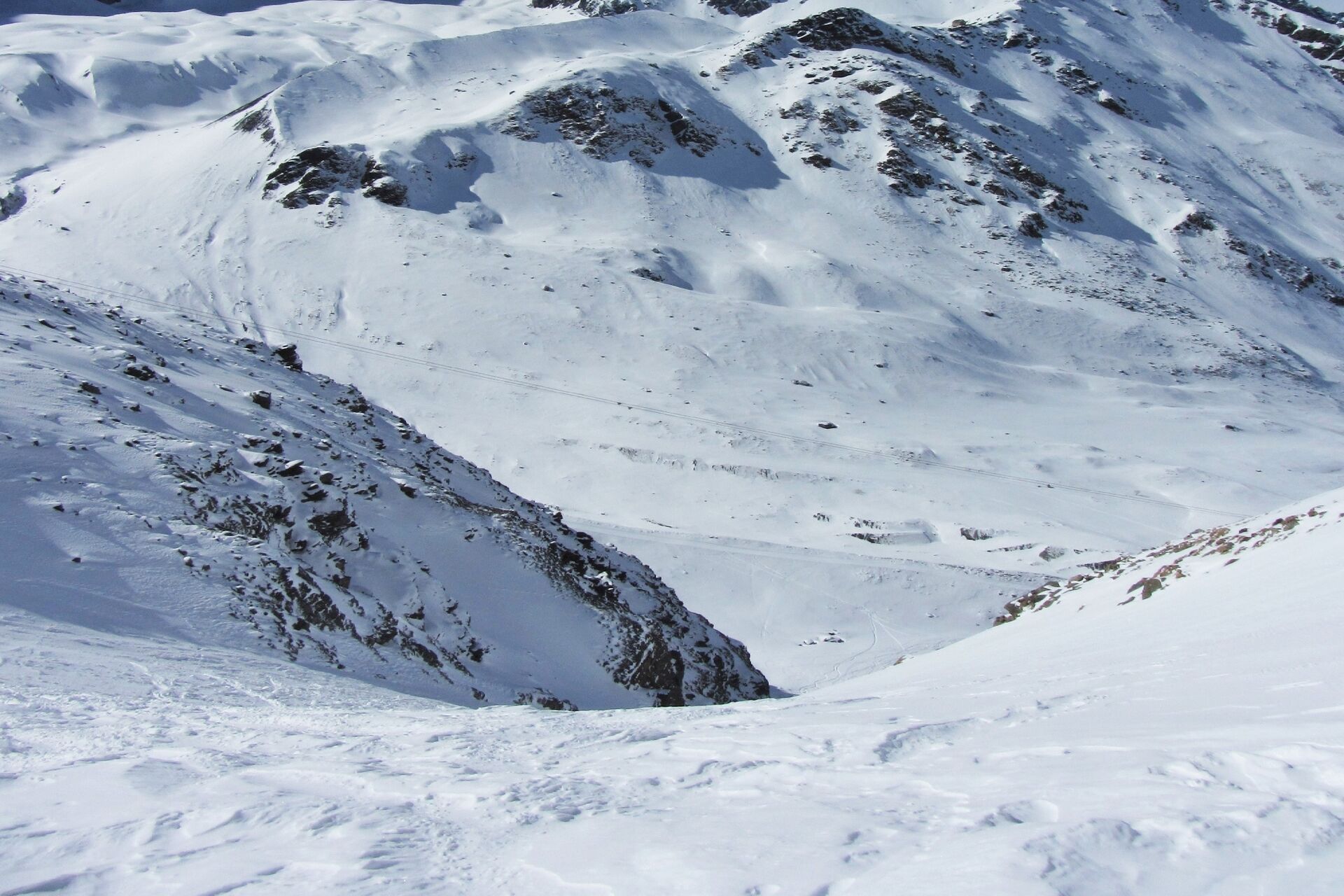 Wir queren die Piste von der Madritschhütte kommend, bevor wir direkt auf die Skiroute Nr. 5, das Kanonenrohr, einsteigen.