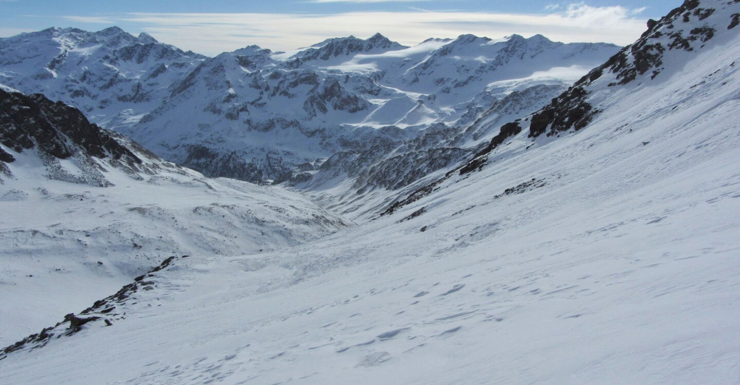Vor uns liegen 450 hm Abfahrt. Bei Wegpunkt 3 ziehen wir die Felle auf und gehen westlich in Richtung Madritschspitze. Auf unserer Tour kam völlig unerwartet ein sehr starker Sturm auf.