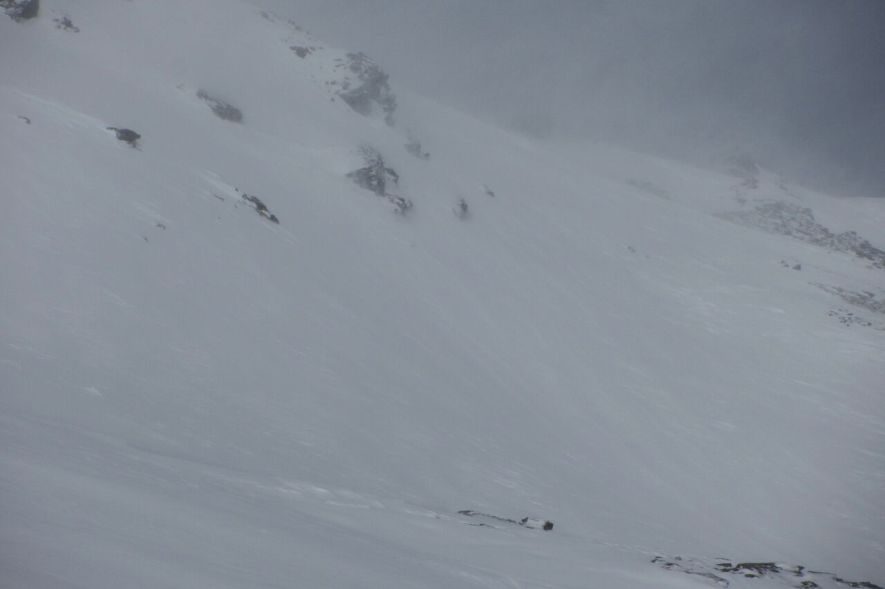 Plötzlich hatten wir einen Wolkendeckel ab 2.900 m und eine damit verbundene sehr schlechte Sicht. Die 60 cm Neuschnee vom Vortag wurden innerhalb kürzester Zeit irgendwohin verfrachtet.