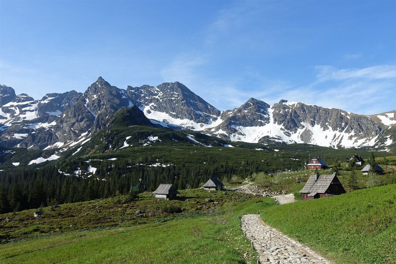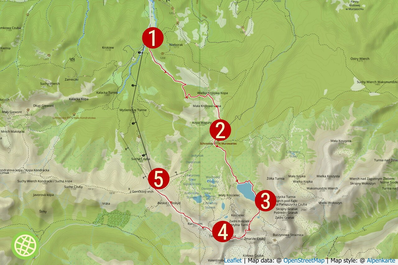 Vor der Talstation der Seilbahn bei 01 Kuźnice (1026 m) gehen wir links am Sportladen vorbei, über die Brücke des Bachlaufs und hinter dem Kassenhäuschen rechts – nachdem wir für das Wegerecht bezahlt haben. Wir laufen auf dem gelben Wanderweg Richtung Dolina Polana Jaworzynka. Es folgt ein langer und eindeutiger Aufstieg, bis der Pfad bei der 1499 m hohen Wegekreuzung Przełęcz między Kopami in einen Weg mündet. Hier befindet sich ein schöner Aussichtspunkt, Richtung Nordwesten liegt Zakopane und Richtung Westen lässt sich der pyramidenartige Gipfel des Giewonts (siehe Tour 71) gut erspähen.