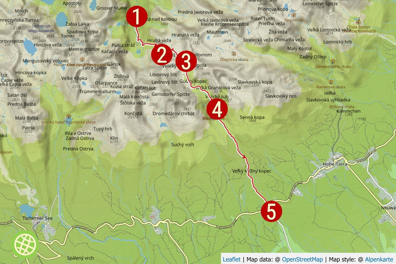 Charakter: Vertrautheit mit exponiertem Gelände und gutes Orientierungsvermögen werden benötigt. Außerdem alpine Erfahrung. Bei einem Wettersturz kann ein Rückzug schwierig werden. Art des Weges: 100 % Pfad. Zusatzausrüstung: Es werden Proviant und Trinkwasser für 2 Wandertage benötigt. Einkehr: Km 7,7 Berghotel Sliezsky dom. Beste Wanderzeit: 14. Juni bis 1. November. Hinweis: Aus Naturschutzgründen sind Teilstücke der Wanderung in der Zeit vom 1. November bis 14. Juni geschlossen. Variante 1: Der konditionsstarke Wanderer kann diese Tour 49 mit der Tour 48 zu einer Tageswanderung kombinieren. Variante 2: Auch lässt sich eine Wanderung über 4 Tage zusammenstellen, indem man zuvor die Touren 52 und 53 geht – die Süd-Nord-Überquerung des Hauptkamms der Hohen Tatra.