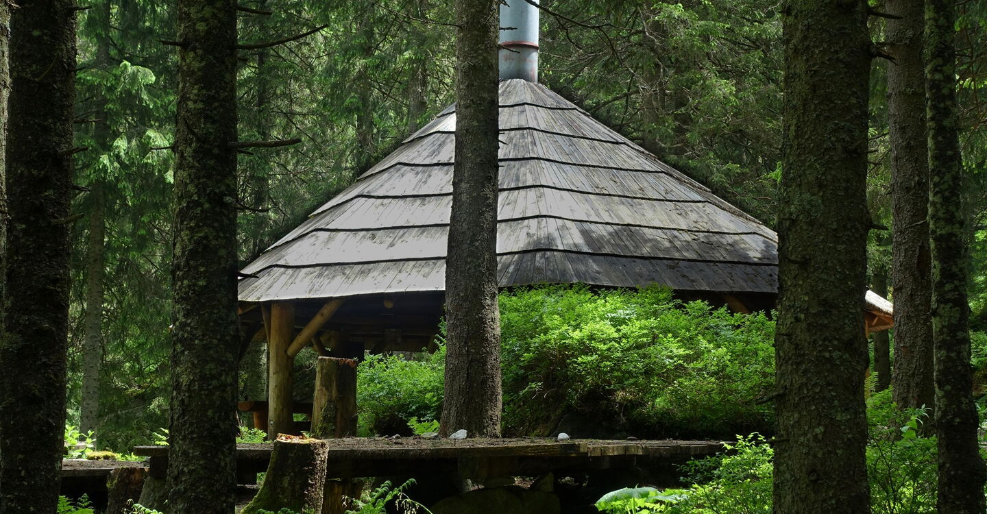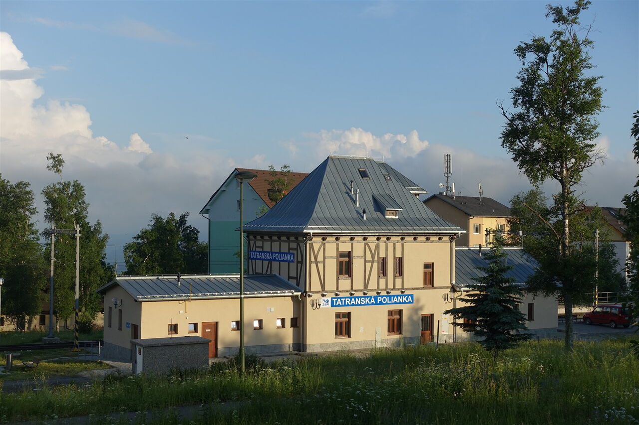 An der darauffolgenden Wegeverzweigung gehen wir geradeaus weiter. Bei einer Brücke, die rechts über den Bachlauf führt, verlassen wir den Hauptweg. Kurz später wechseln wir ein weiteres Mal zur anderen Bachseite hinüber. Wir überqueren die asphaltierte Straße und setzen unseren Abstieg hinter dem überdachten Picknickplatz fort. Mehrmals queren wir die Zufahrtsstraße zum Sliezsky dom. Bei einem Parkplatz gehen wir dann bis zur Hauptstraße herunter, queren diese und erreichen nach wenigen Metern bergab den Bahnhof 05 TEŽ Tatranská Polianka (941 m).