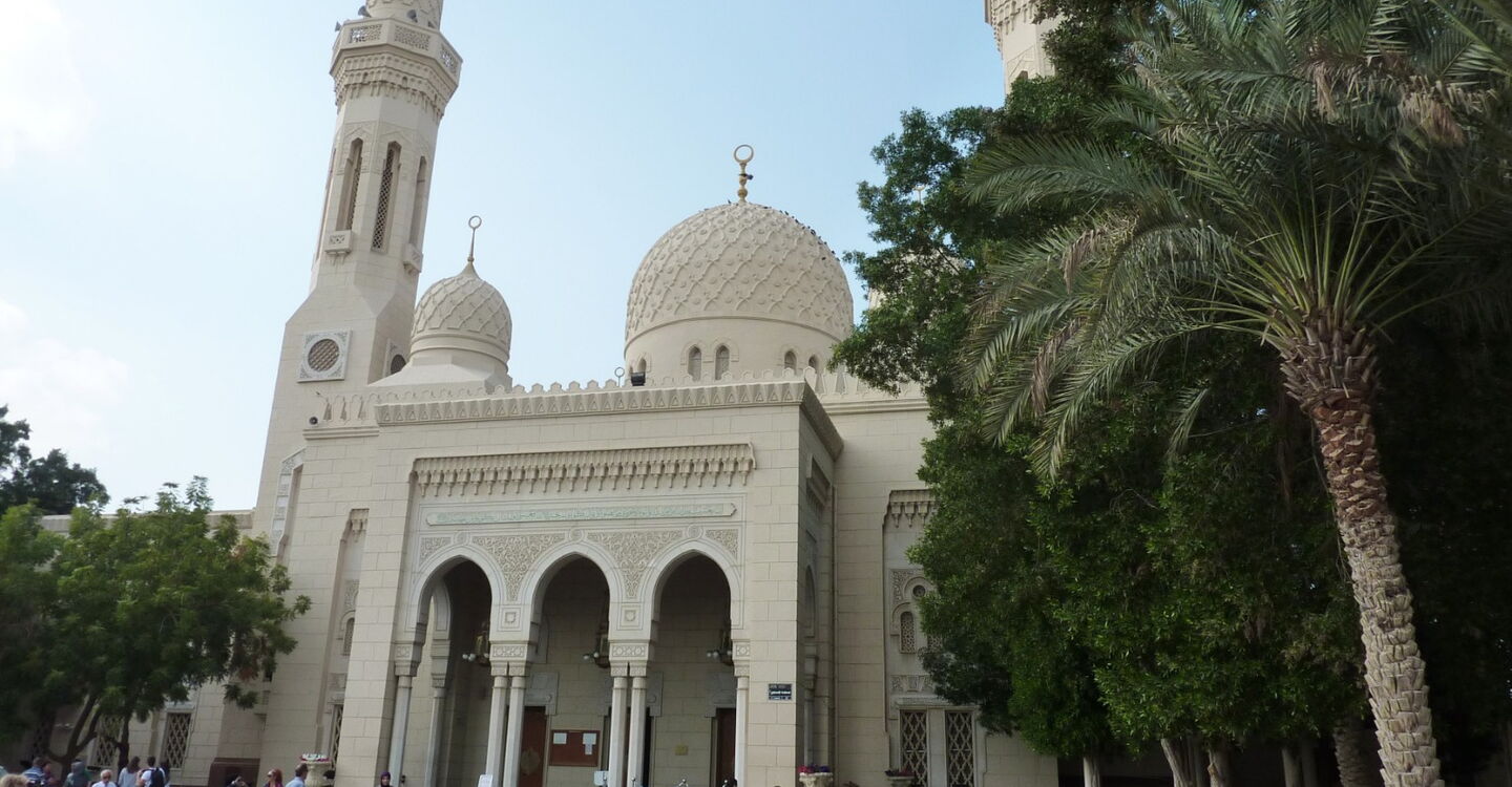 Die Jumeirah-Moschee ist die größte in Dubai und aufgrund ihrer elfenbeinernen Außenfassade ein imposantes Bauwerk. Sie kann im Rahmen einer kostenpflichtigen Führung besichtigt werden.