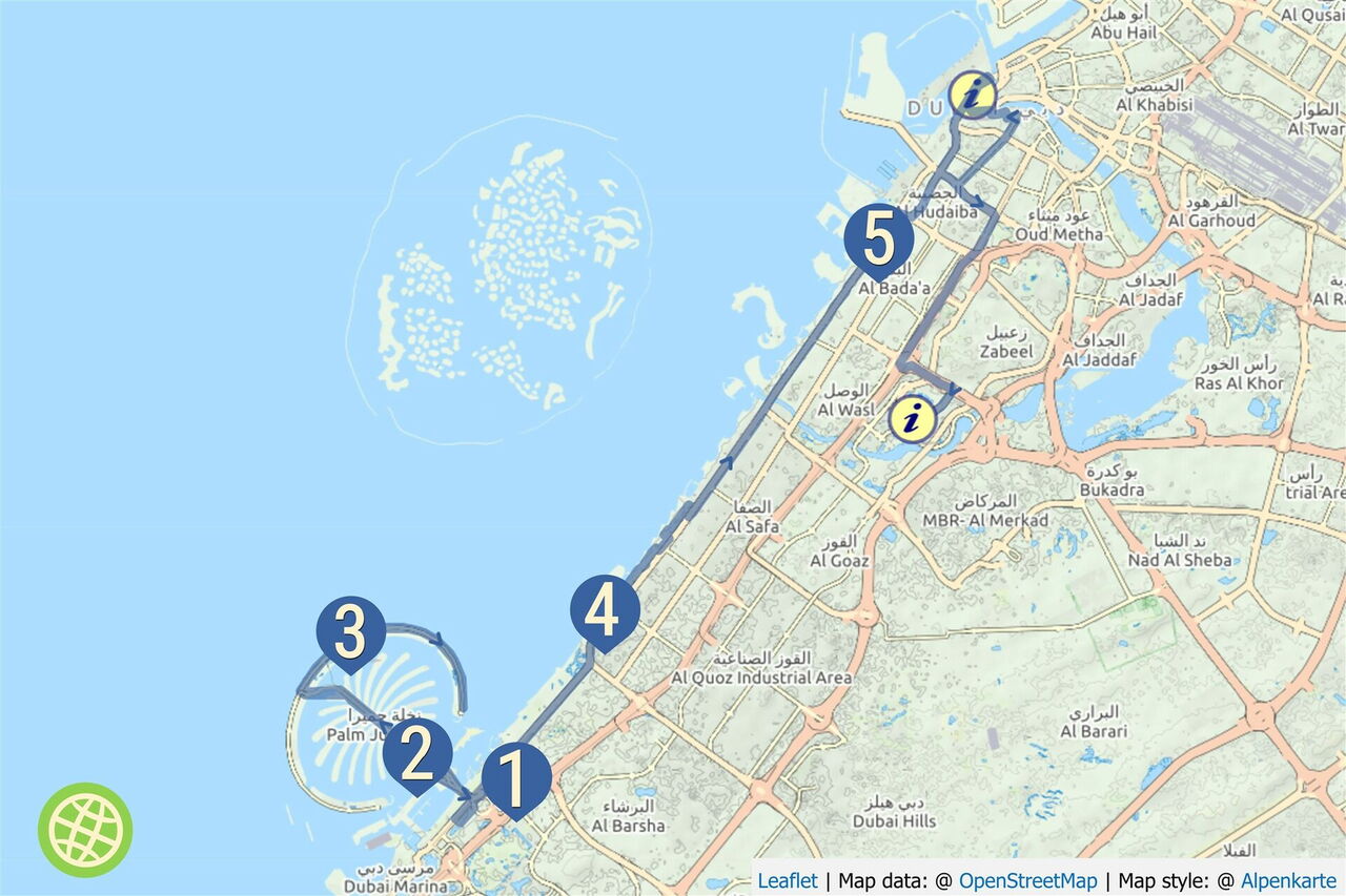 Dubai ist die Stadt der Superlativen und eine der Megacitys weltweit. In den hier beschriebenen drei Touren sind alle „Top 10 Highlights“ der größten Stadt der Vereinigten Arabischen Emirate beschrieben. Noch vor 50 Jahren war Dubai ein verschlafenes Dorf am Dubai Creek. Nach dem Ölboom, der die finanzielle Machbarkeit vieler Projekte realisierte, befindet sich Dubai nun in einem Tourismusboom. Da die Stadt schneller wächst, als das Bauland zur Verfügung steht, werden einfach künstliche Inseln im Persischen Golf aufgeschüttet. Über die ursprüngliche Tradition und Kultur - diese ist heutzutage nicht mehr existent - kann man mehr im kleinen Dubai Museum lernen. Bitte bedenken Sie bei Ihrer Reiseplanung, dass die Lufttemperatur für uns Mitteleuropäer nur von Oktober bis März ertragbar ist.