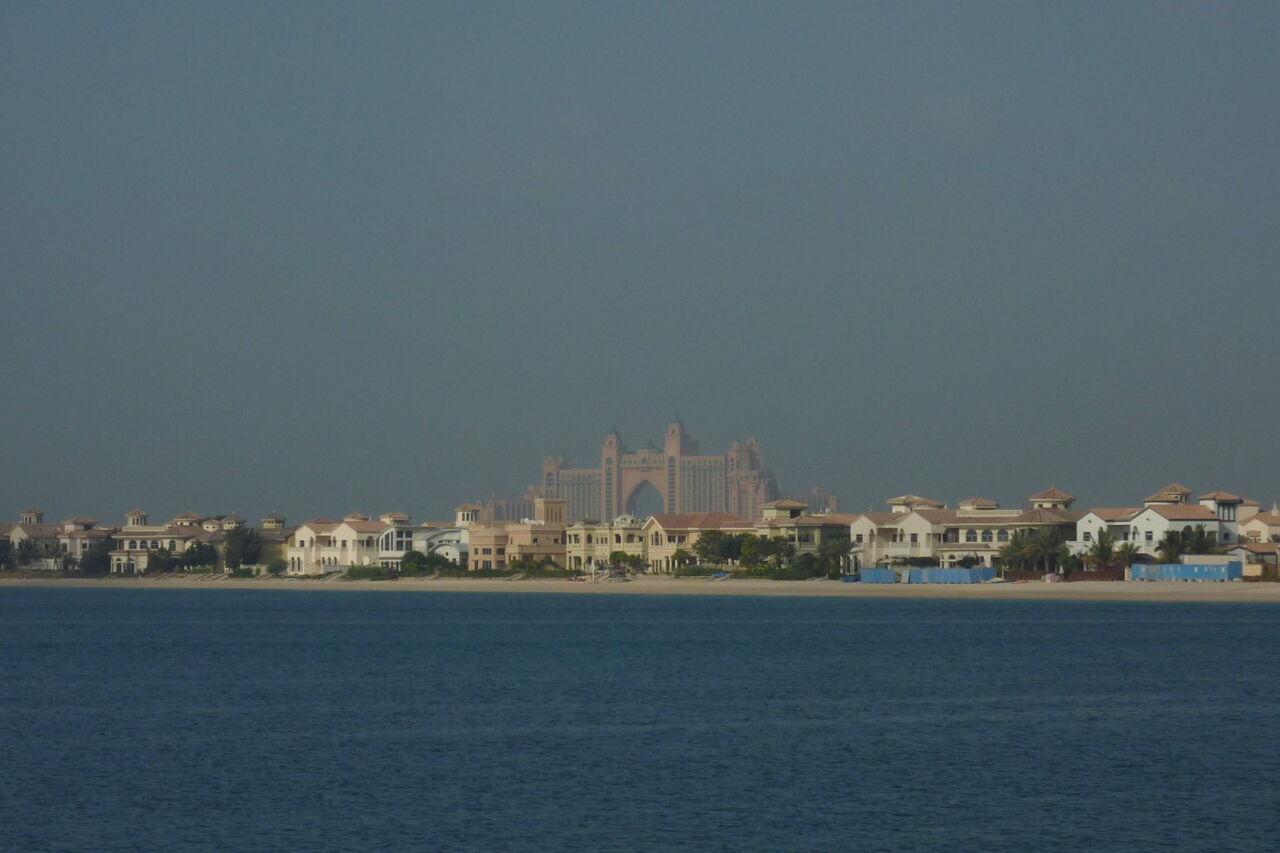 Wie ein majestätisches Tor erhebt sich die Hotelanlage Atlantis mit 1.539 Zimmern, dem eigenen Wasserpark sowie 20 Restaurants und Bars. Seit 2008 zählt es zu einem der Wahrzeichen Dubais.