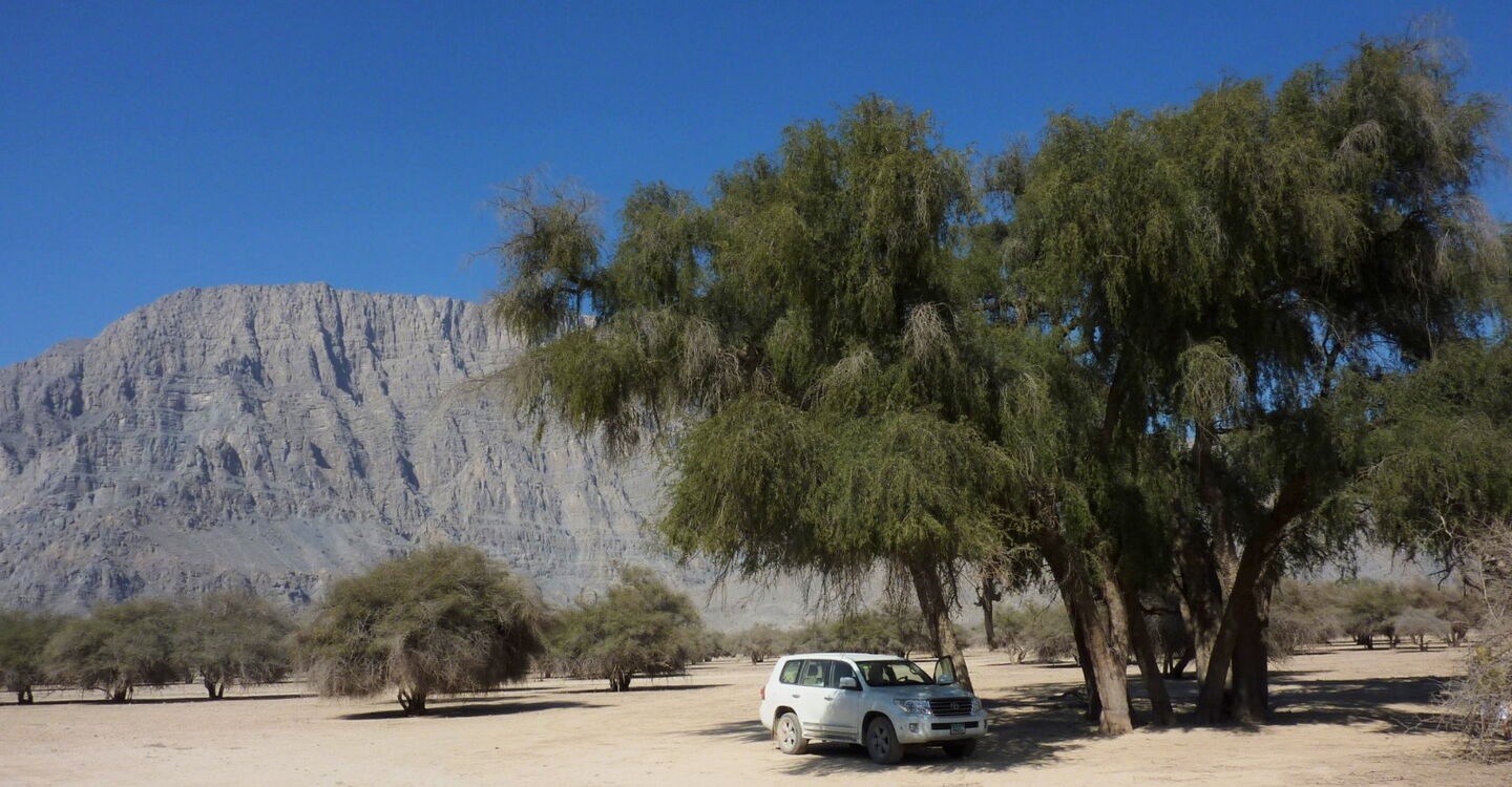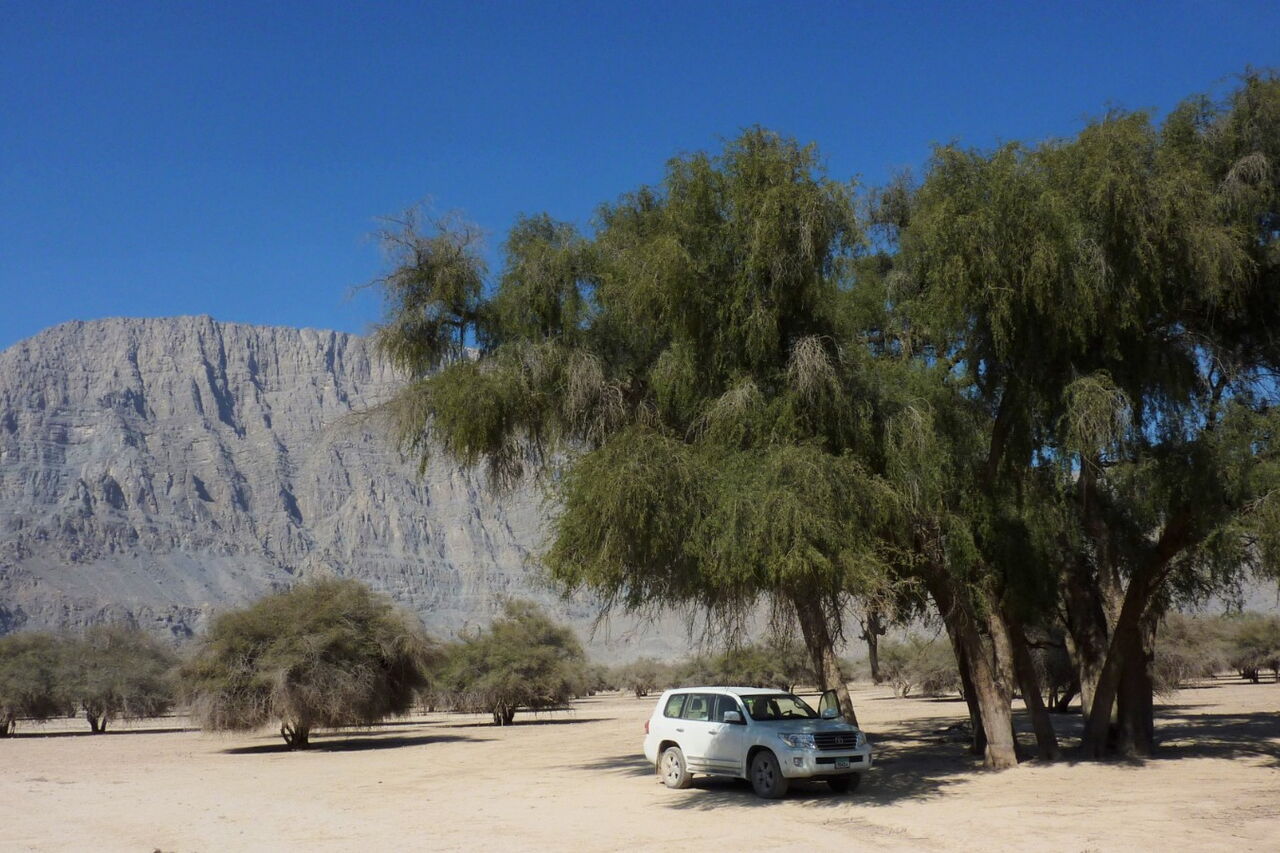 Wir kommen am Jebel Harim, der im militärischen Sperrgebiet liegt, an und haben die Möglichkeit zu zwei Wanderungen. Nach 60 km kommen wir zum Rawdah Bowl mit seinem Akazienwald.