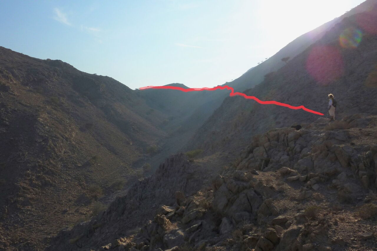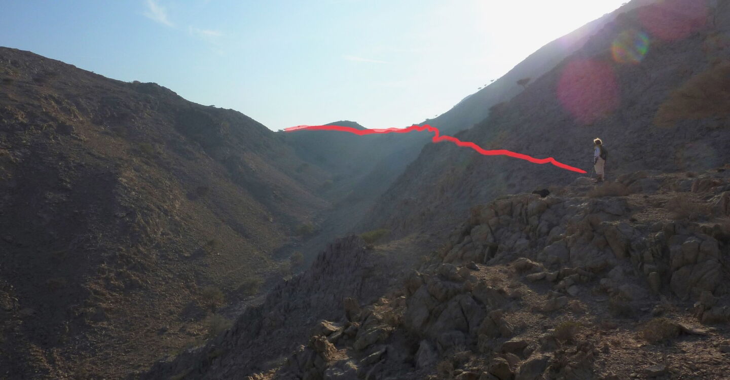 Ab hier ist ein Pfad zu erkennen, der nur leicht an Höhe verliert und ca. 600 m quer durch den links liegenden Hang führt, bis wir an eine weitere Wasserscheide kommen, wo rechts ein paar Akazien erhöhter stehen.
