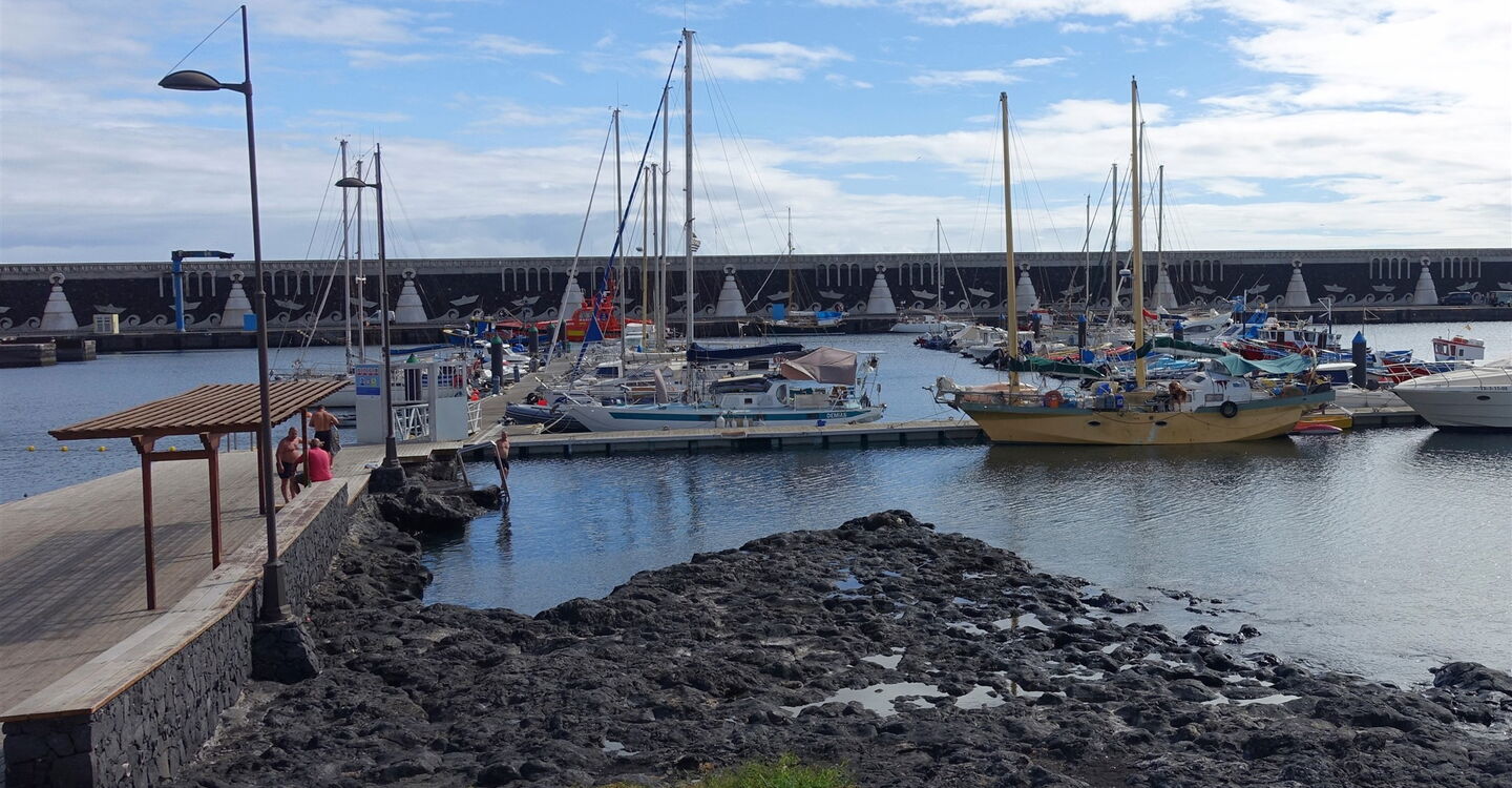 Nach 425 m queren und nach 60 m tangieren wir die Hauptstraße Richtung La Restinga. Nach weiteren 250 m setzen wir den Abstieg auf dem Camino (02) halb links (678 m) fort. Der gemütliche Abstieg führt durch ein Weinanbaugebiet, bis der Weg in eine Schotterpiste übergeht. Wir passieren den rechts von uns liegenden Vulkan, danach öffnet sich ein weiter Blick bis zur Hafenanlage von La Restinga.
