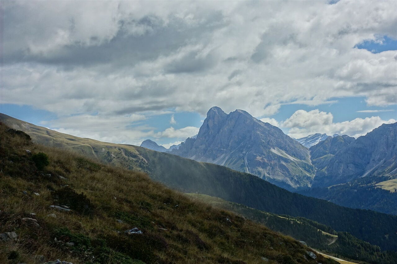Ca. 30 m hinter einer scharfen Linkskurve, die der Pfad macht – von hier schaut man geradeaus auf den Peitlerkofel –, verlassen wir diesen Pfad nach halb rechts, auch ausgeschildert mit Wanderweg 7. Von hier aus kann man bei gutem Wetter bereits die Plosehütte sehen. Noch einmal gabelt sich der Weg, 04 7 oder 7a (2.307 m)? Das ist hier die Frage.