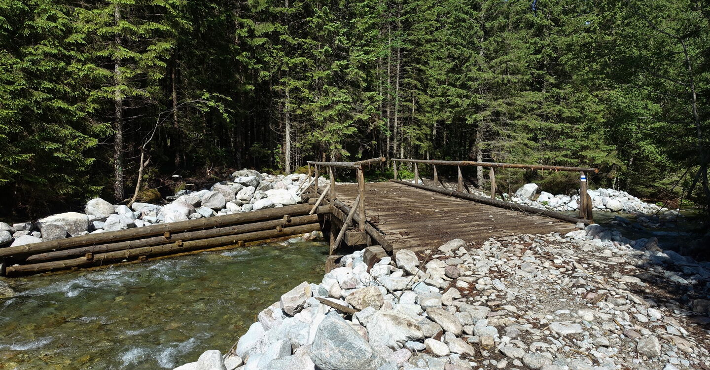 Ein zweites Mal überqueren wir den 04 Biela Voda (1097 m) und gehen weiter und tiefer in das Bielovodská Dolina. Die Forststraße gabelt sich ein erstes Mal, wir gehen geradeaus weiter.