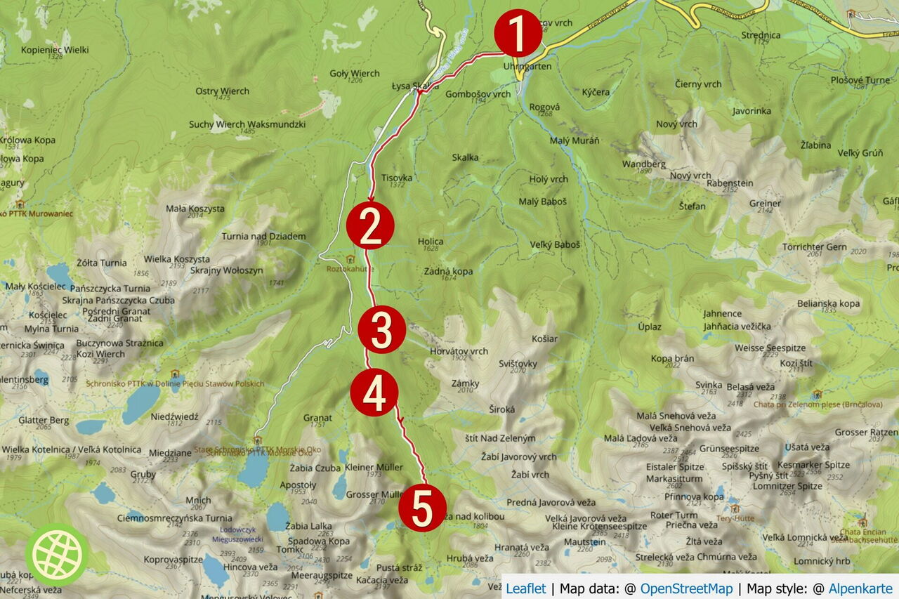 Vom Hotel Montfort 01 Tatranská Javorina (979 m) gehen wir bis zur Hauptstraße vor und dann am Straßenrand rechts Richtung Polen. Wenige Autos fahren vorbei, trotzdem ist Vorsicht geboten. Bei dem Dorf Lysá Poľana, an der Grenze zwischen der Slowakei und Polen, befindet sich ein Minimarkt. Direkt vor der Brücke an der polnischen Grenze gehen wir links vor dem Flusslauf auf den blau markierten Wirtschaftsweg.
