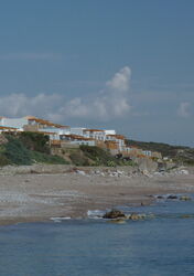 Hier unterqueren wir die Brücke weglos und gehen nun im Trockenflussbett, bis wir den (05) Strand von Lachania (1 m) erreichen. Es folgt ein astreiner Spaziergang an dem 1,7 km langen Kieselsteinstrand. Sobald wir auf gleicher Höhe mit den Flutlichtern für die Tennisplätze sind, gehen wir auf der bergauf führenden Piste oberhalb der Häuser des Thalasso Spa Resort – aber schon in der Anlage – bis zu unserem geparkten Pkw.