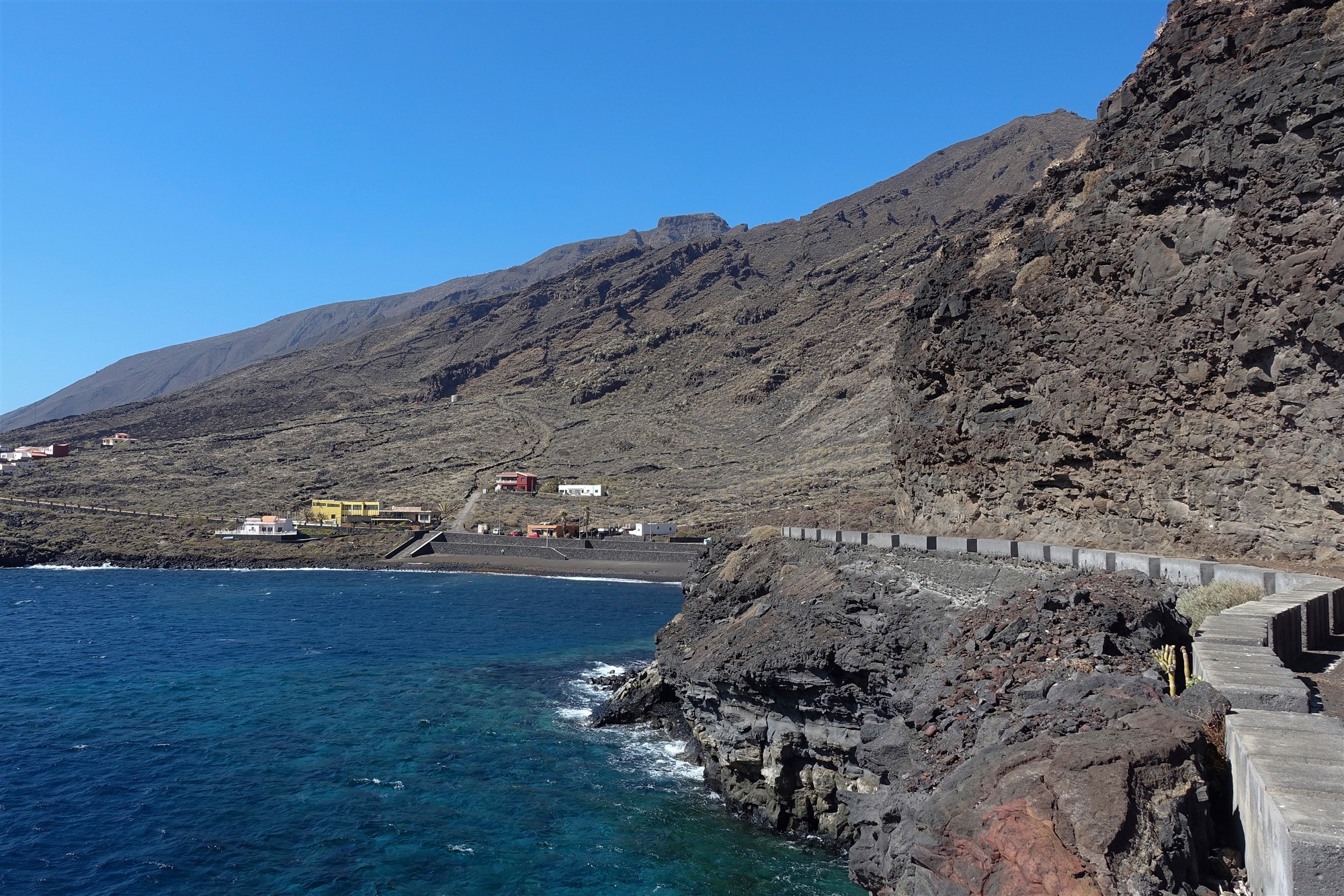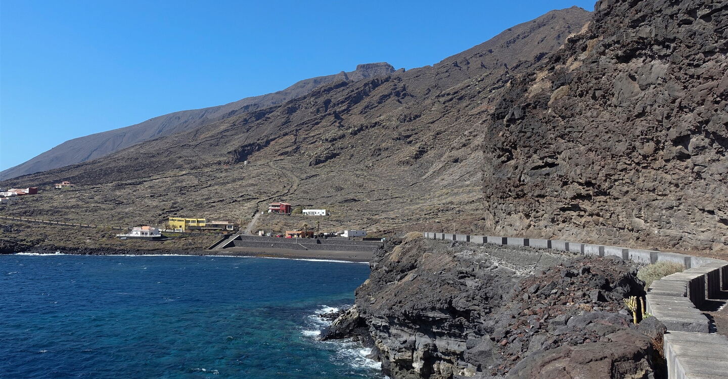 Auf dem Seitenstreifen laufend, folgen wir der Ausschilderung Richtung Timijiraque. Vor dem Tunnel gehen wir auf der alten Straße direkt oberhalb des Meeres entlang, schon bald sehen wir das kleine Dorf Timijiraque mit einem der wenigen Sandstrände auf El Hierro. Die Bushaltstelle von (03) Timijiraque (18 m) befindet sich nach 300 m im Ortskern, wir gehen aber 50 m hinter dem Fischrestaurant, bei dem hellbraunen Gebäude, die Straße rechts bergauf – ein kurzes Stück asphaltiert, kurz später ein Camino. Wir queren einen riesigen Schluchtauslauf und kommen an einem Wassertank vorbei. Es folgt ein gelb-weiß markierter Wanderweg. Auf den nachfolgenden 900 Höhenmetern queren wir sechsmal die Asphaltstraße.