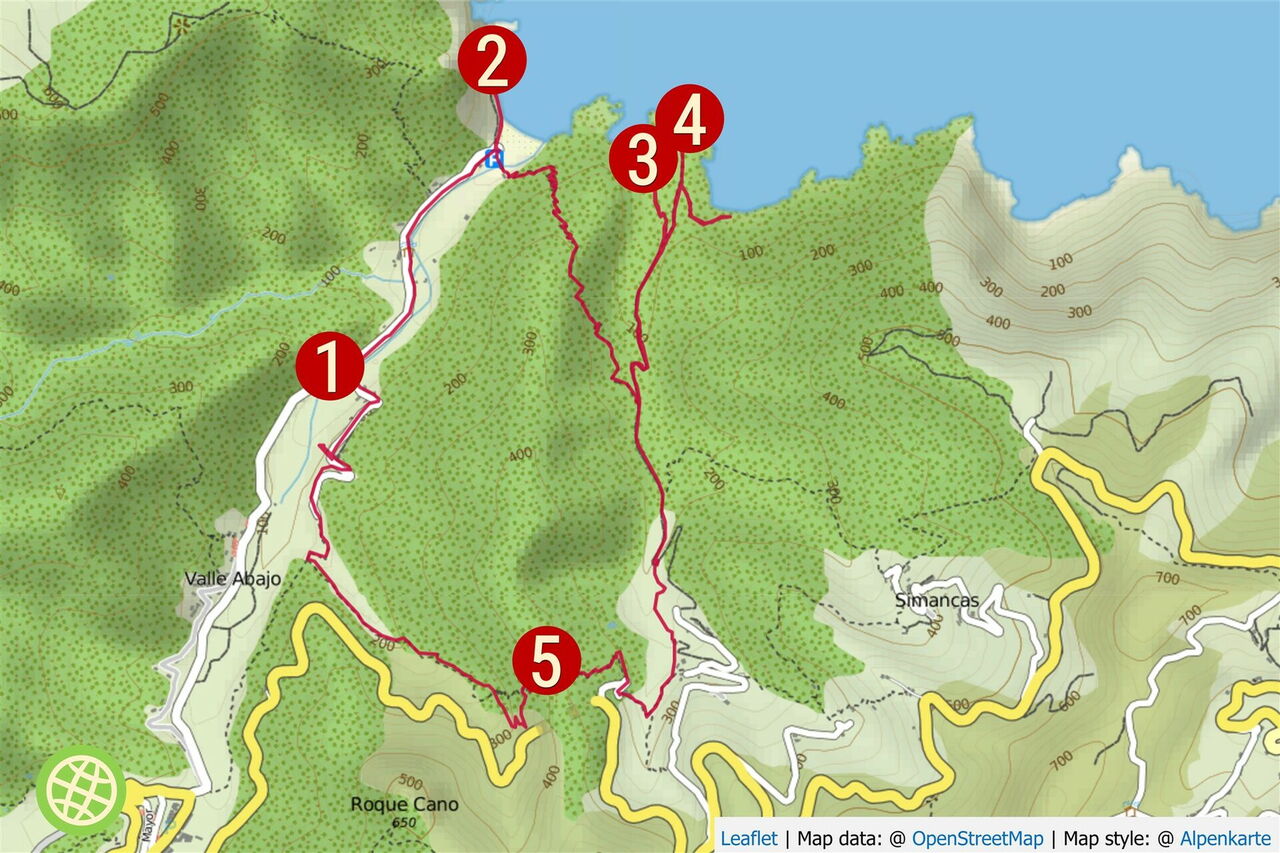 In einer 180-Grad-Linkskehre der Schotterpiste verlassen wir diese nach rechts Richtung Hermigua. Kurz hinter den ersten Häusern von Tamagarda endet der Weg und wir gehen rechts Richtung Vallehermoso. Sobald wir eine Wegverzweigung mit drei Wahlmöglichkeiten erreichen, nehmen wir den Pfad mit der Wegbeleuchtung. Nach einem kurzen Stück auf einer Asphaltstraße verlassen wir diese in der folgenden Linkskehre bereits wieder, um nach rechts auf einen wunderschön angelegten Wanderweg einzuschwenken. Nach der Überschreitung eines Bergrückens steht imposant direkt vor uns der 220 m höhere Felskoloss (05) Roque Cano (439 m). Nach einem steilen Abstieg gehen wir rechts talauswärts und erreichen bald einen Abzweiger nach links Richtung Vallehermoso. Diesen ignorieren wir aber und gehen rechts über die Terrassenfelder, bis wir die Asphaltstraße erreichen, die uns zum Parkplatz führt.