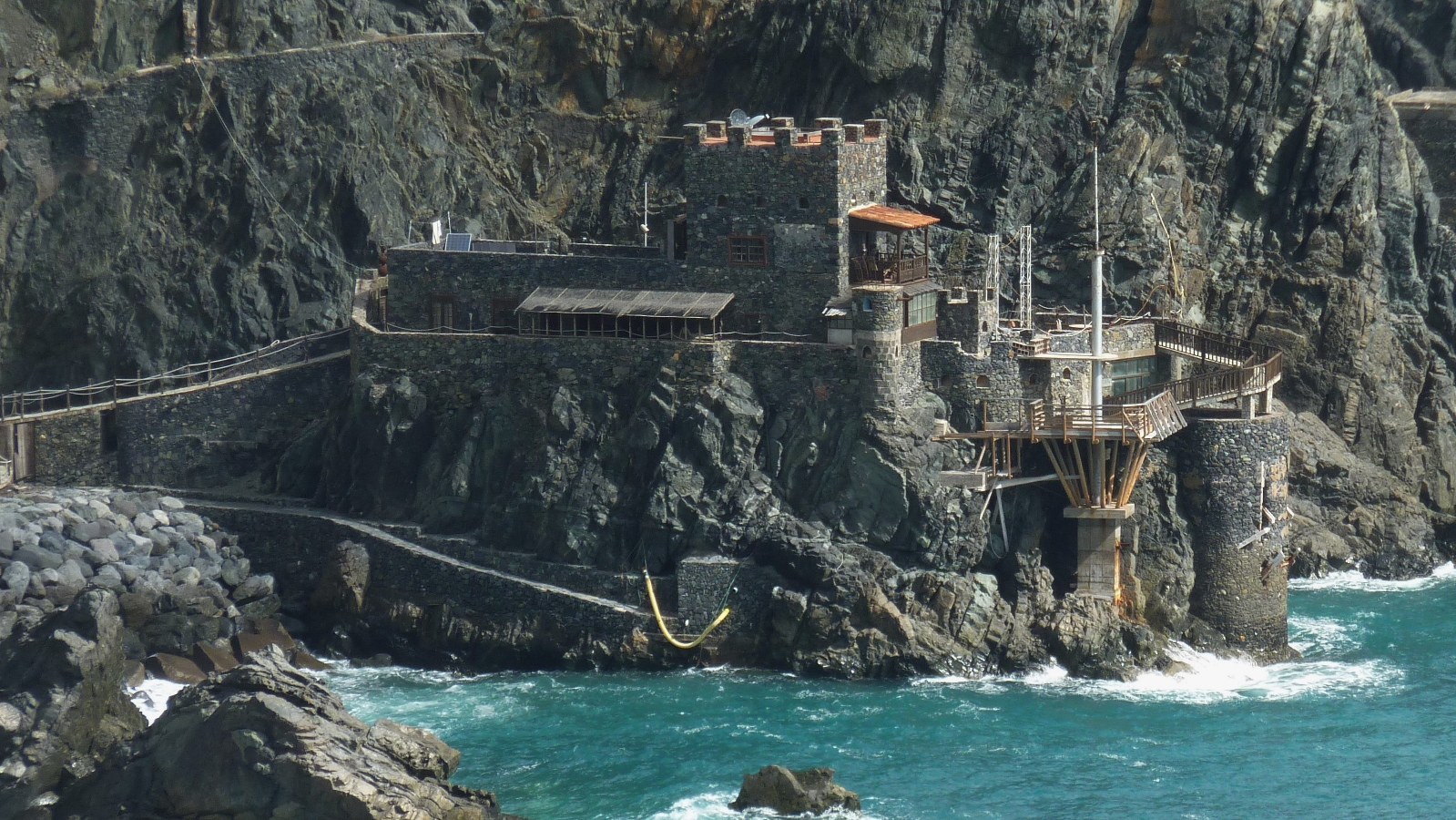 Lohnenswert ist ein Abstecher zu dem auf einem Felsen im Atlantischen Ozean thronenden (02) Castillo del Mar (30 m). Die links vom Strand liegende Bananenverladestation wurde 1890 errichtet. Im Jahr 1950 ist der Betrieb schließlich eingestellt worden. Vorbei an den Meeresschwimmbecken und hinter der kleinen Kirche verlässt ein Wanderweg in östlicher Richtung den Strand. Auf einem perfekt ausgebauten Camino überschreiten wir schnell die vor uns liegende Anhöhe und schauen tiefer herunter in das Barranco de los Zarzale, wo wir den weiterführenden Weg bereits sehen können. Nach kurzem Abstieg mündet unser Wanderweg in eine Schotterpiste.
