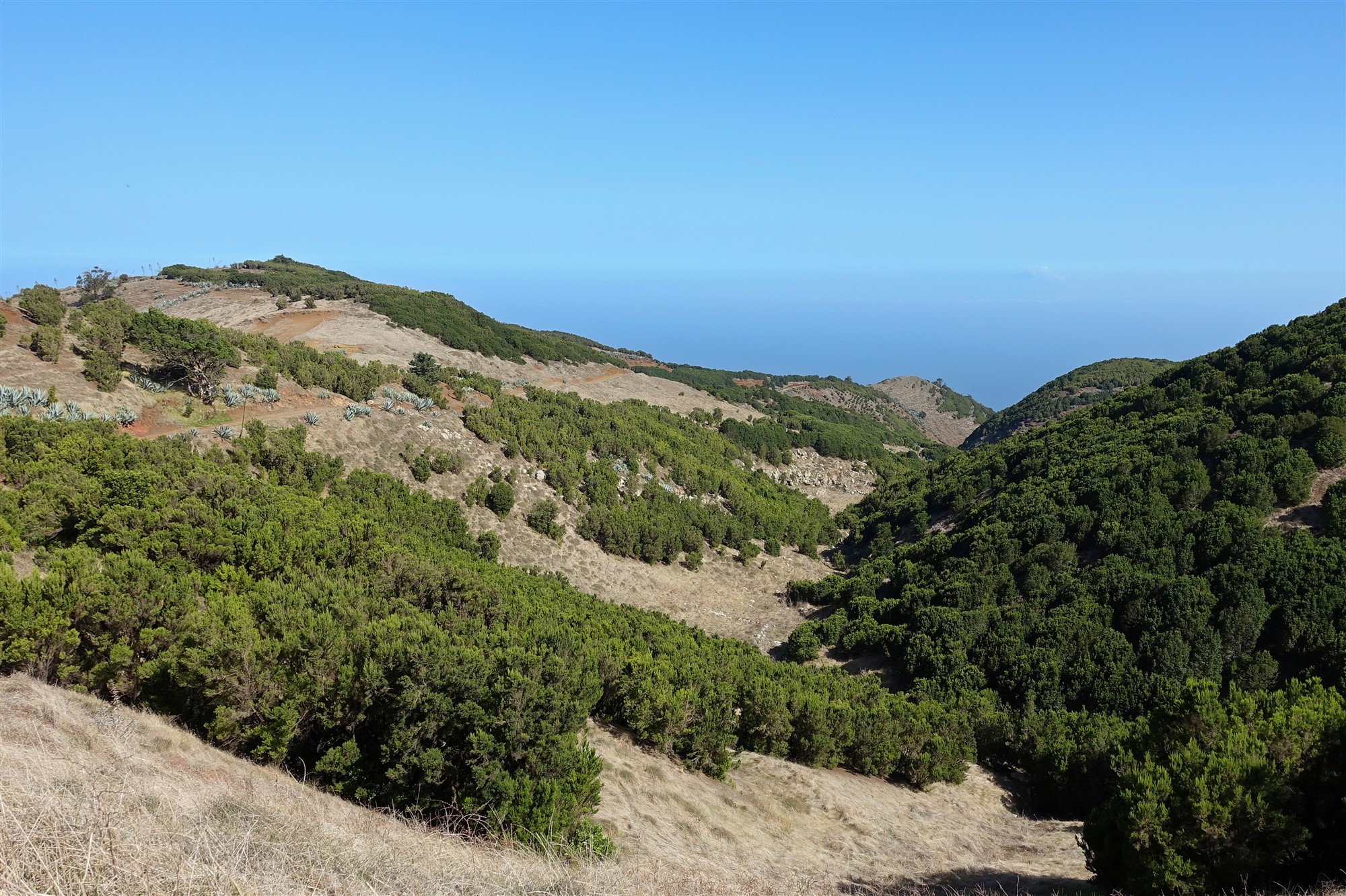 Ab hier gehen wir auf dem Fernwanderweg, der die Insel auf ihrer gesamten Länge durchquert. Fortan ist der Pfad gut markiert und breit ausgebaut, sodass es beinahe unmöglich ist, sich zu verlaufen. Wir queren zweimal die Straße und erreichen die (05) La Caldereta de Tinor (803 m), den Kessel des ältesten Vulkans der Insel. Heutzutage beherbergt die relativ erdbebensichere Caldera das obere Wasserreservoir der Wind-Wasserkraftanlage. Ein letztes Mal queren wir die Hauptstraße und gehen links hinter der Leitplanke auf dem gepflasterten Weg nun direkt nach Valverde herunter.