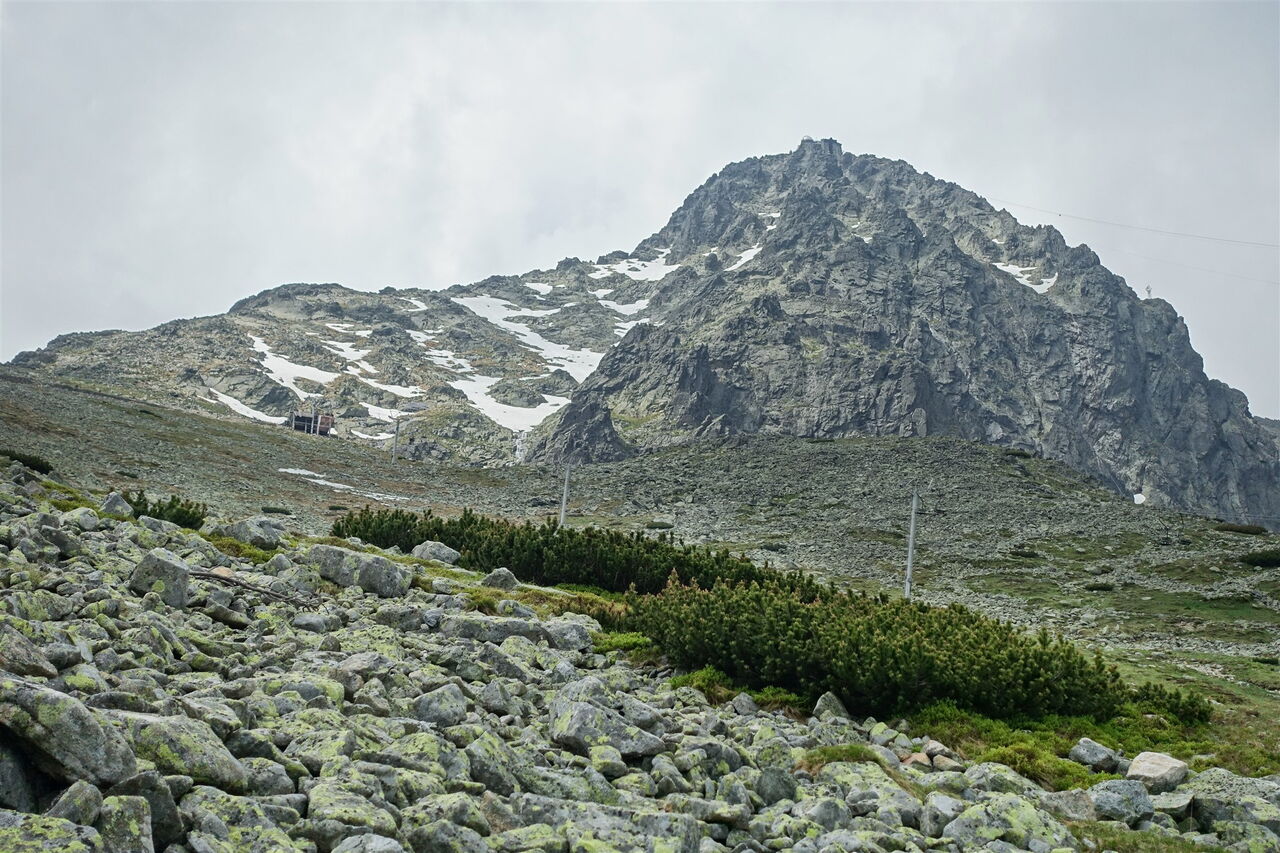 Von dem großen Platz zwischen der Bergstation der Kabinenbahn, der Talstation der Seilbahn Lomnický štít und dem dahinter liegenden 01 Skalnaté pleso (1754 m) gehen wir nur 10 Meter in Richtung des Doppelsessellifts, der einen zum Lomnické sedlo bringen würde. Dort verlassen wir den Weg und gehen an einer Absperrung sowie an zwei vereinzelt stehenden Hütten vorbei.