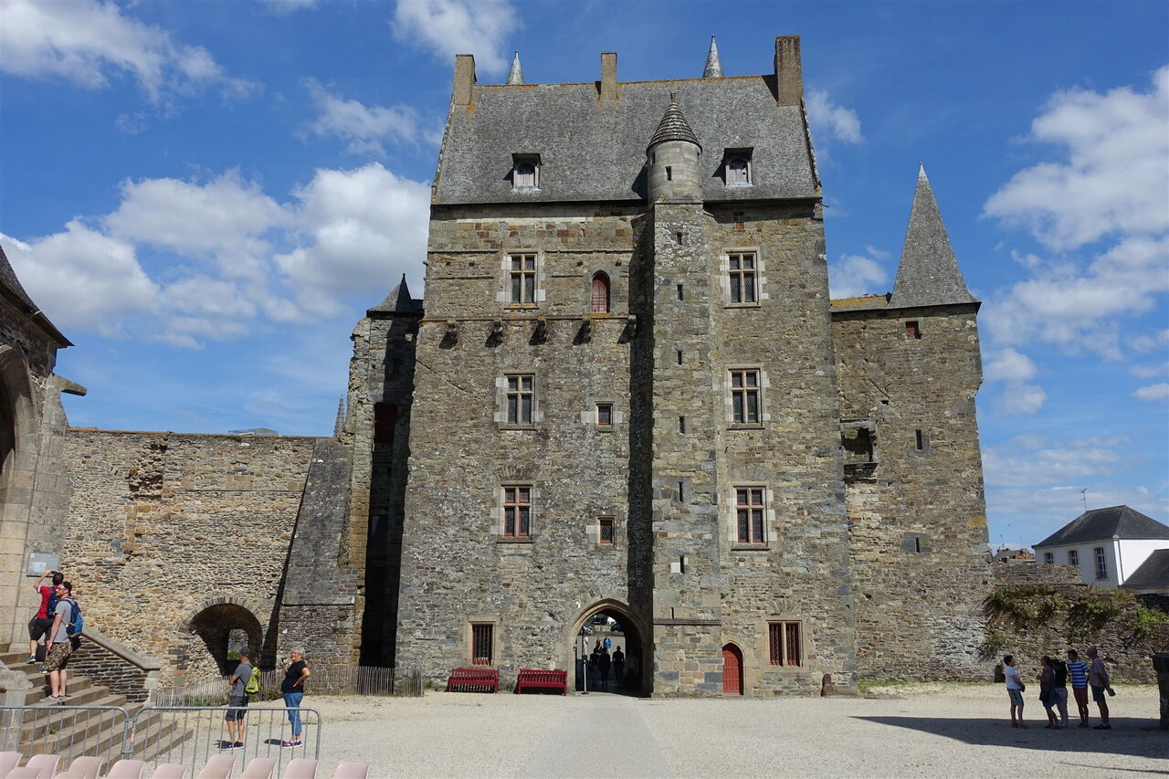 Sonst gehen wir an dieser Stelle rechts und biegen bei der nächsten Möglichkeit in die Rue du Château ein, um nach wenigen Metern über die Zugbrücke das 03 Château de Vitré (99 m) zu bewundern, eine Festung, die den Weg in die Bretagne verteidigen sollte – ein sehr schönes Vorbild für die Militärarchitektur des Mittelalters.