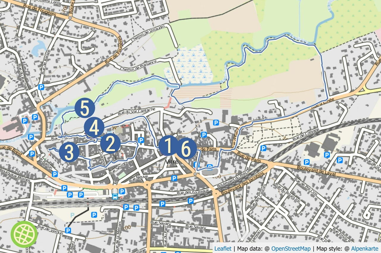 Wir gehen halb links über den großen Platz vor dem Schloss und dann in die Rue Notre-Dame, um vor der Église Notre-Dame de Vitré links zu gehen und durch das vom Hinweg bekannte Poterne Saint-Pierre den Stadtkern zu verlassen. Wir gehen nun 125 m links, um eine 180°-Kehrtwendung zu machen und die kleine Parkanlage zu queren. Der weitere Wegabschnitt führt nun entlang des Baches 04 La Vilaine (64 m). Auf dem fortlaufenden Weg überqueren wir zuerst eine kleine und später eine große Brücke, um vor dem nachfolgenden Treppenaufstieg halb links auf dem bergauf führenden und asphaltierten Pfad weiterzugehen. Vor einem Parkplatz gehen wir halb links in die Sackgasse, dann durch eine Kleingartenkolonie und vor einem Zaun scharf links, nun wieder direkt auf einem Pfad neben dem Flusslauf. Ein kleiner Tümpel wird in einer Rechtskehre an seinem Uferrand umlaufen. Bei einem Stromkasten endet unser Ausflug ins Grüne. Auf einer Piste und kurz später auf einer Straße erreichen wir die Rue d’Ernée, auf der wir 450 m rechts gehen, bis diese endet.