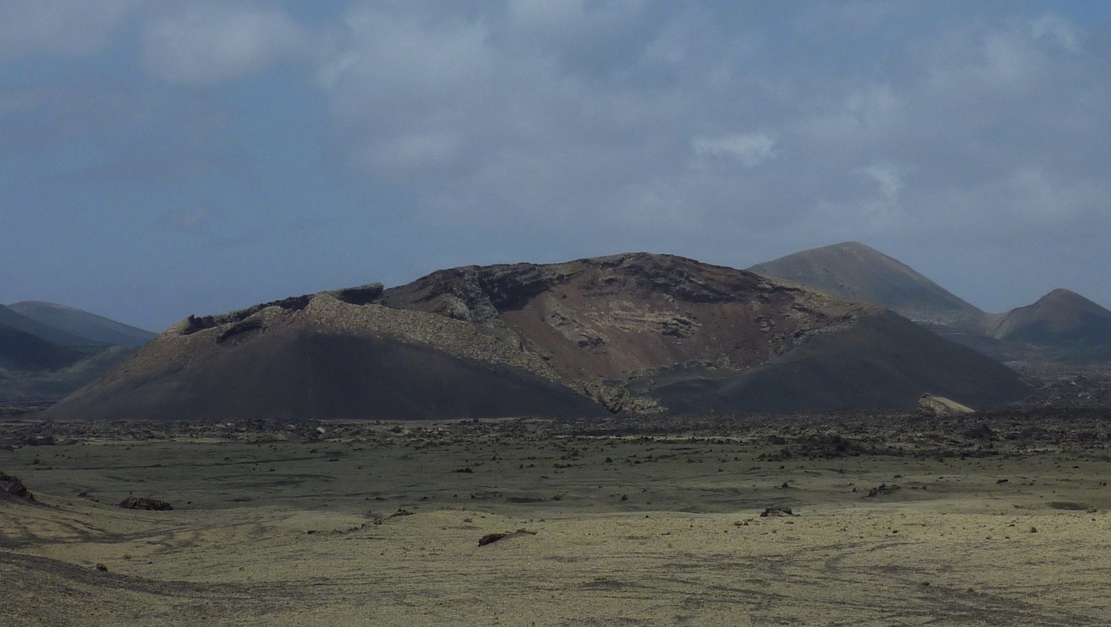 Zunächst gehen wir ein Stück parallel zur (02) LZ-56 (336 m). Wir befinden uns mittig zwischen der Montaña Negra (518 m) - der Vulkan links von uns - und der Caldera de Los Cuervos. Bei näherer Betrachtung könnte man denken, dass die Montaña Negra ebenfalls von 1730-1736 aktiv gewesen ist. Weit gefehlt - da der Vulkan in unmittelbarer Nähe der Vulkanausbrüche stand, wurde er nur von 3-5 m Vulkanasche begraben. Der Vulkan selber stammt aus der früheren Entstehungsgeschichte von Lanzarote.