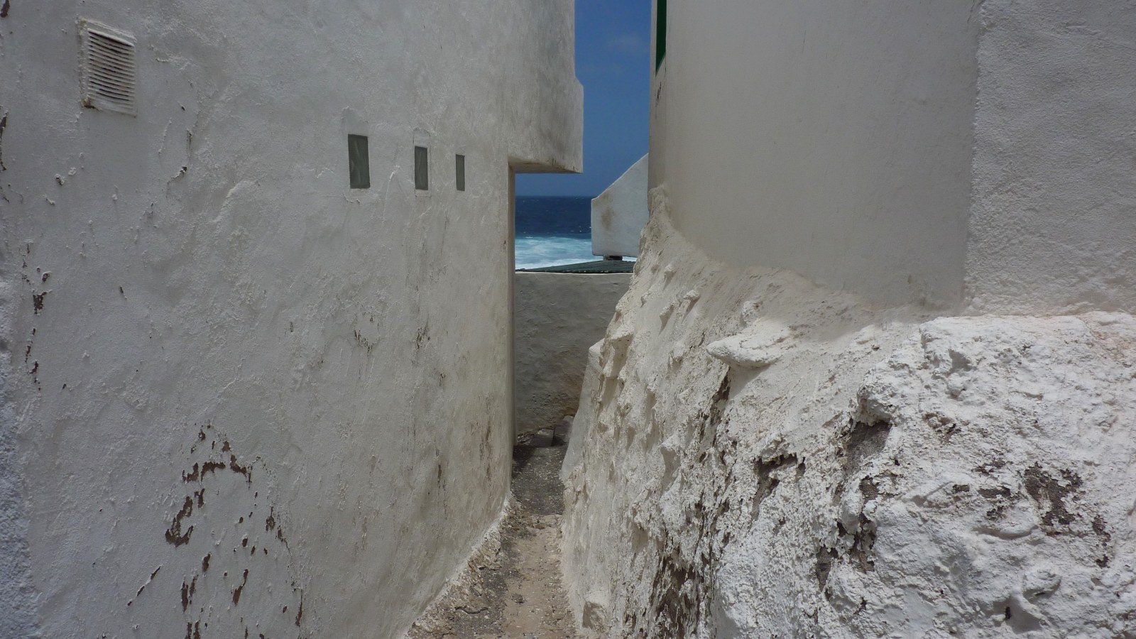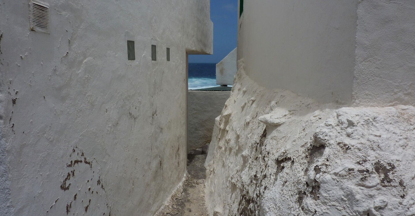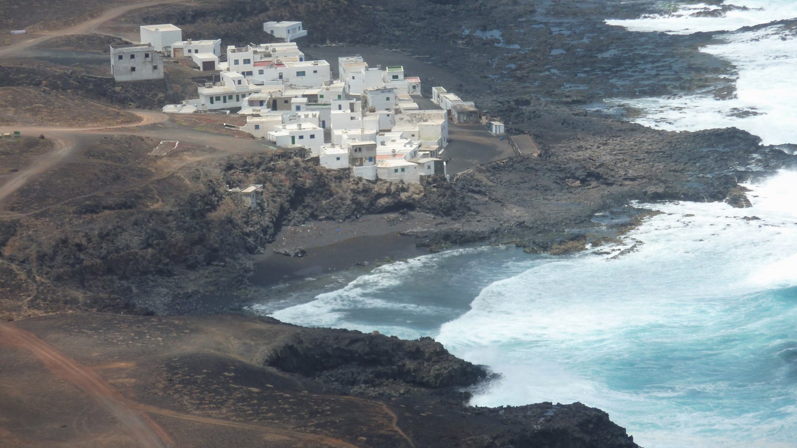 Nach einer Anhöhe können wir in der Ferne das Piratendorf (03) Tenesar (8 m) sehen. Oberhalb der steilen Klippe führt der Pfad bis in ein Barranco, dem wir rechts für 170 m in Richtung Küste folgen. Anschließend gehen wir direkt auf die weißen Häuser von Tenesar zu. Bei einer gepflegten Brotzeit kann man beobachten, wie Riesenwellen mit ihrer enormen Gewalt an der Küste brechen. Am östlichen Rand des Dorfes liegt noch versteckt die nicht ganz saubere Playa Tenesar, die man je nach Stand der Gezeiten über einen Pfad unterhalb der Klippe erreichen kann.