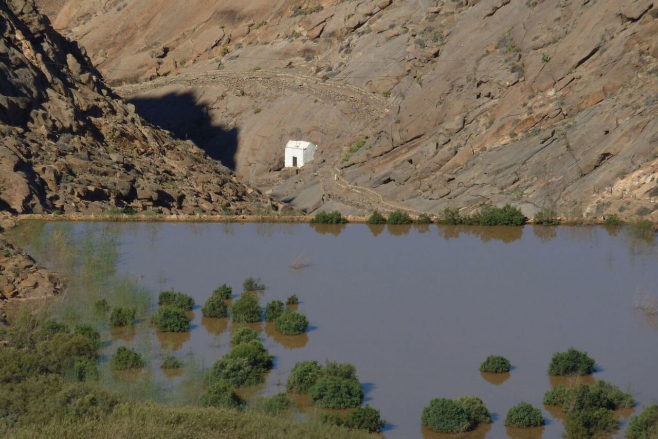 Für den Rückweg gehen wir zunächst 100 m auf dem Hinweg zurück, um an der Weggabelung vor der Brücke rechts auf die beginnende Schotterstraße abzubiegen. Je nach Wasserstand des Barrancos kann man direkt durch dieses wandern oder es etwas erhöht umlaufen. Nach 200 m wechselt der Hauptweg auf die andere Uferseite und nach weiteren 300 m endet er gänzlich. Unweigerlich geht es nun im Barranco weiter. Schlussendlich wird der Bewuchs durch Tamarisken so eng, dass ein Weiterkommen nicht mehr möglich ist. 200 m nach einem Gebäude auf der rechten Seite beginnt oberhalb des Barrancos ein Pfad. Bei der nach 160 m folgenden Weggabelung halten wir uns halb links, in Richtung der Dammkrone des (05) Stausees (225 m). Von nun an geht es auf derselben Strecke wie auf dem Hinweg zurück.