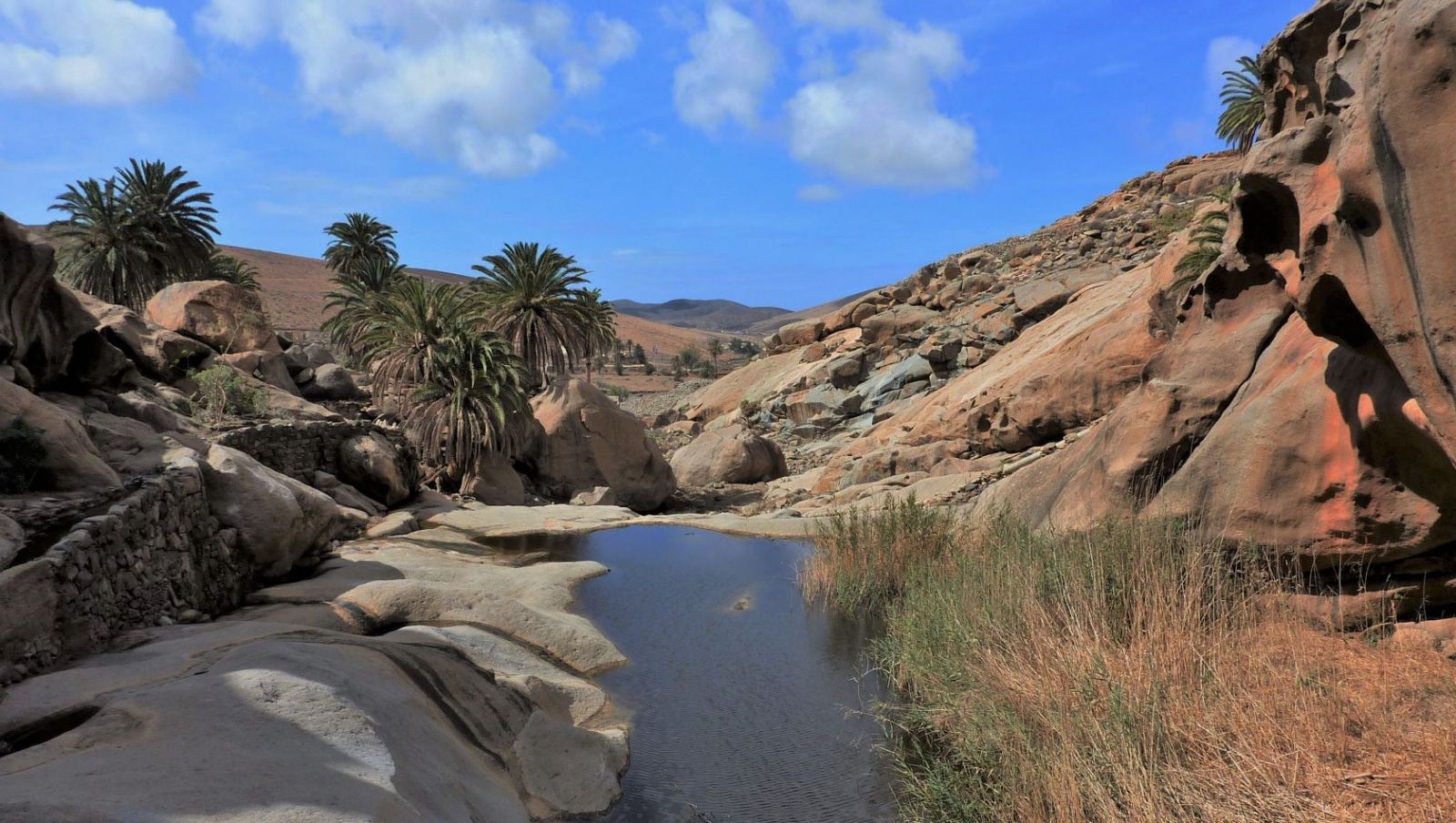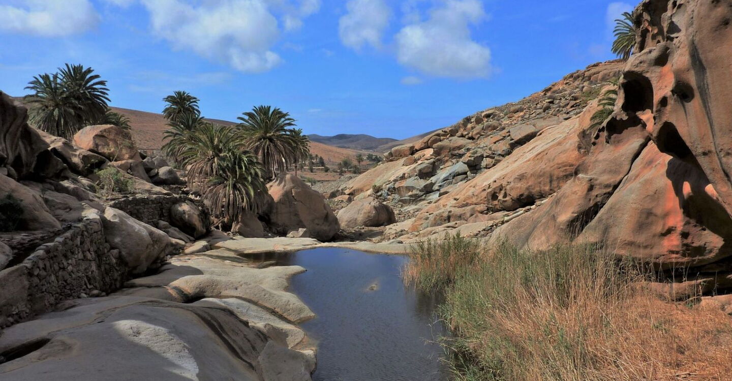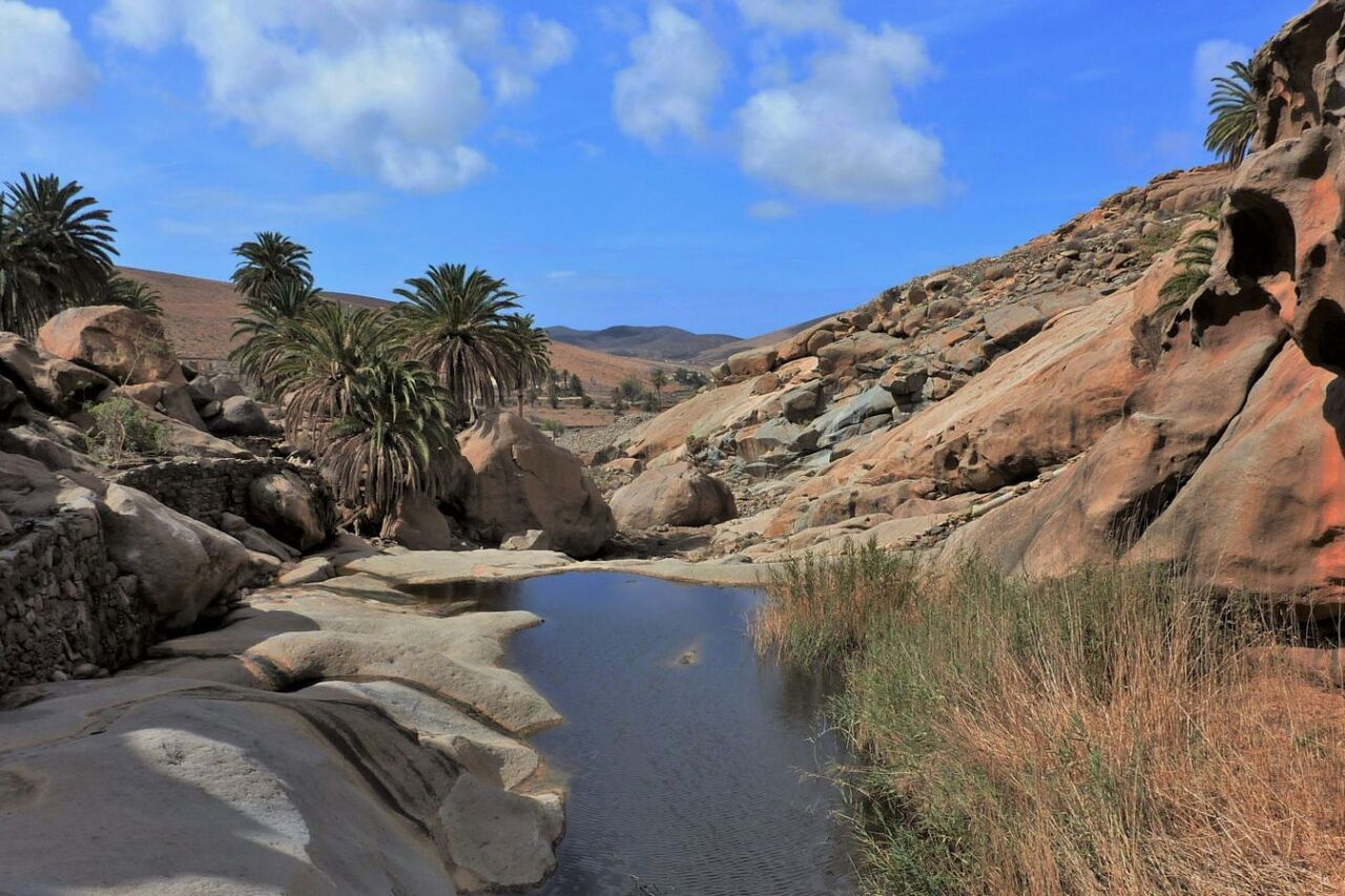 Vom (01) Start und Ziel (129 m) wandern wir in östliche Richtung auf das große Felsmassiv zu. In der Ferne sehen wir eine bizarre Felsschlucht, durch die unser weiterer Weg führt. Aufgrund der Höhenlage gibt es in der Region um Vega de Rio Palmas weitaus mehr Regen als in anderen Regionen Fuerteventuras. So können unter anderem Getreide, Kartoffeln und Hülsenfrüchte angebaut werden. Der Weg führt vorbei an Ruinen und zahlreichen Kanarischen Dattelpalmen. Es geht über eine kleine Brücke und dann in nördliche Richtung, bis wir das Barranco de las PeNitas erreichen. Den halbrechten Abzweiger ignorieren wir, steigen in das Barranco herunter und queren es. Nach weiteren 50 m geht es auf dem klar erkennbaren Pfad in nördliche Richtung. In einer großen Rechtskurve gewinnen wir schnell an Höhe, bis der Weg direkt durch die spektakuläre Felsschlucht verläuft.