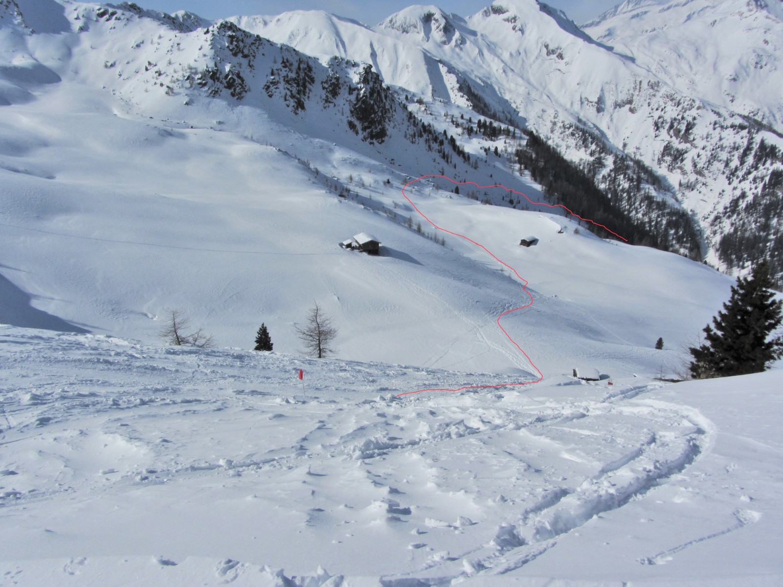 Beim Mühlwalder Jöchl geht es auf Fellen auf dem Kellerbauer Höhenweg, bis wir vor dem Gornerberg rechts ins weite Tal abfahren. Wir fahren ca. 1,6 km, bis es flacher wird.