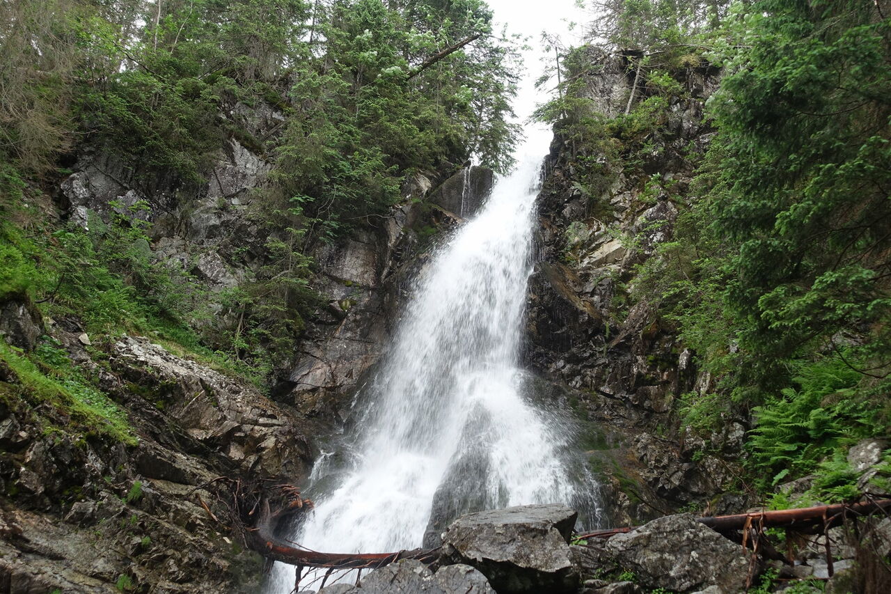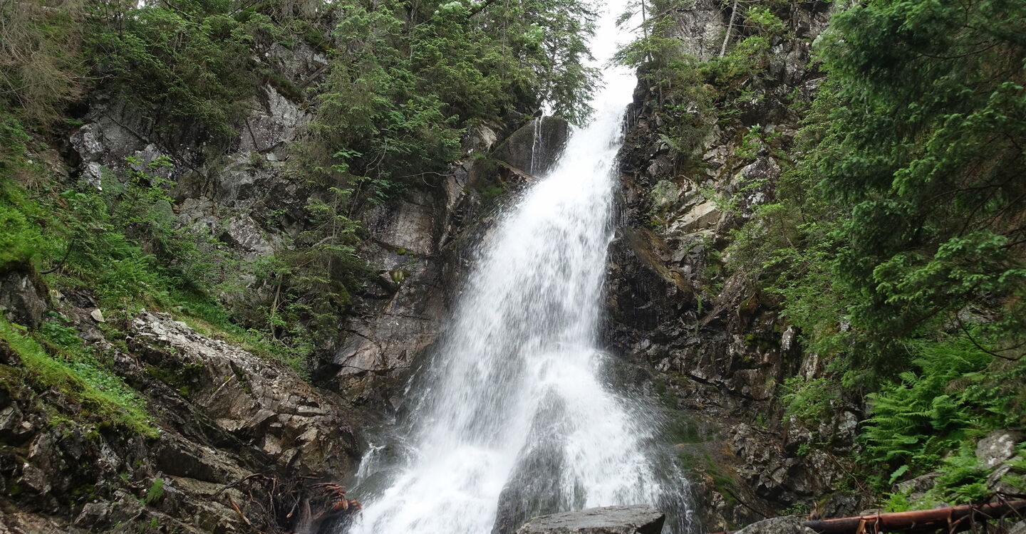 Sehr empfehlenswert ist bei dem Wegweiser zum 05 Roháčsky vodopád (1269 m) der Abstecher zum ca. 18 m hohen Wasserfall. Wir kehren anschließend zum Hauptweg zurück, setzen den Abstieg fort und erreichen einen Wendeplatz für Fahrzeuge. Diesen Platz verlassen wir bereits nach 50 m nach halb links, um auf einem Waldweg – kurz parallel zu einem Bachlauf, den wir wenig später überqueren – weiter talwärts bis zum Parkplatz und Ausgangspunkt zu wandern.